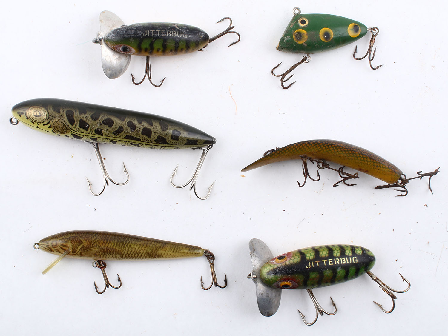 Lot of 6- mixed lures, all different colors/patterns/sizes. Grade: Very Good - Value: 10 to 50