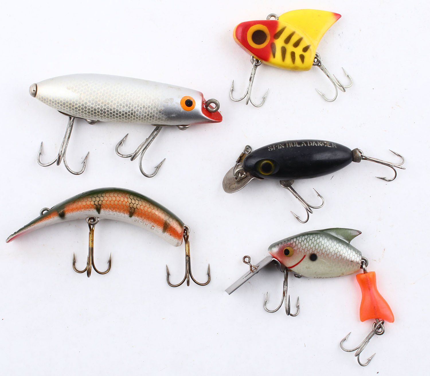 Lot of 5- fishing lures, all different colors/patterns/sizes. Grade: Very Good+ - Value: 10 to 50