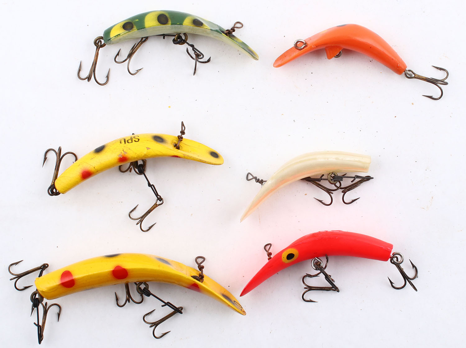 Lot of 6- fishing lures, all different colors/patterns/sizes. Grade: Very Good+ - Value: 10 to 50