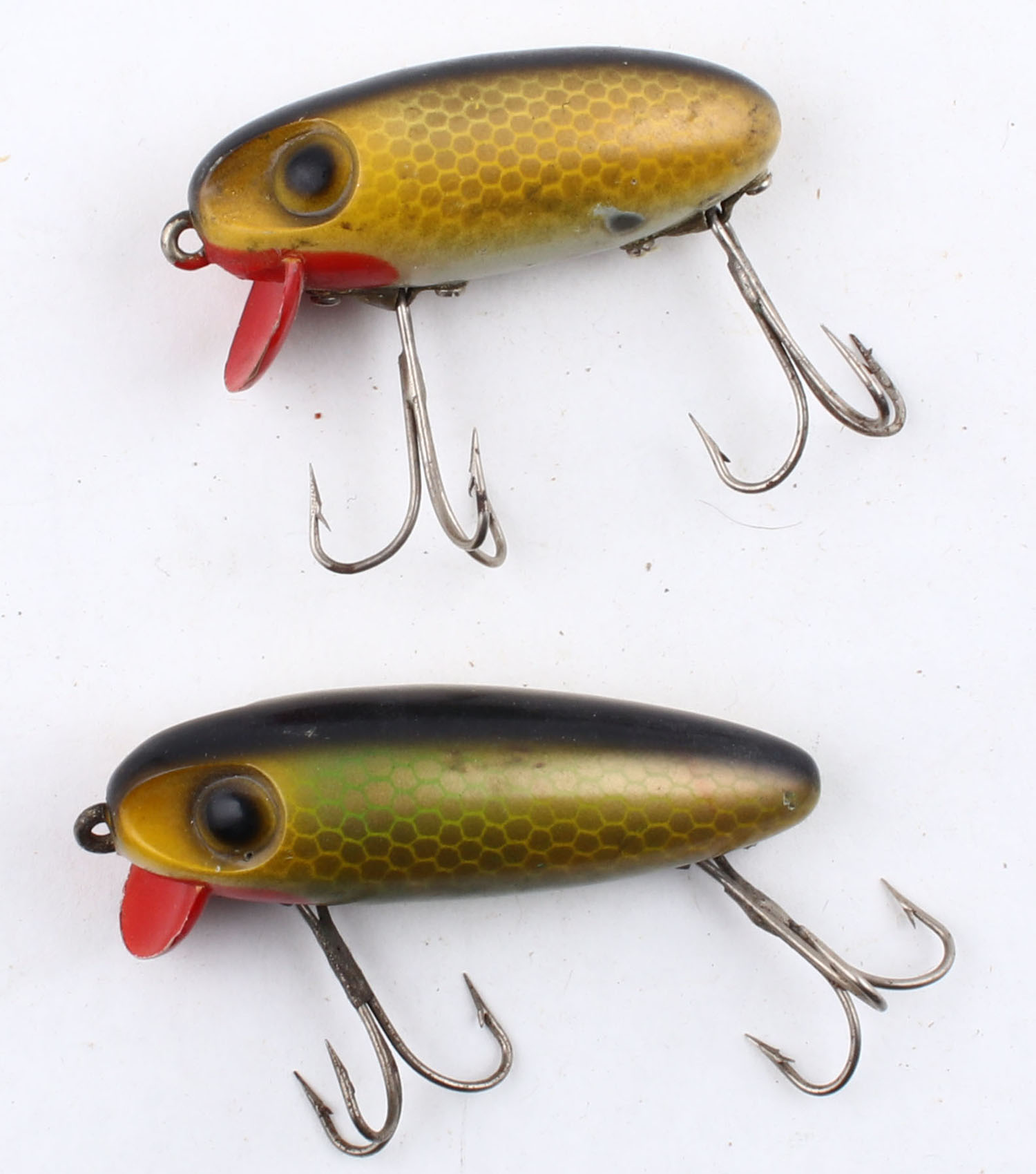 Lot of 2- fishing lures, similar style & color, surface rigs. Grade: Very Good+ - Value: 6 to 30