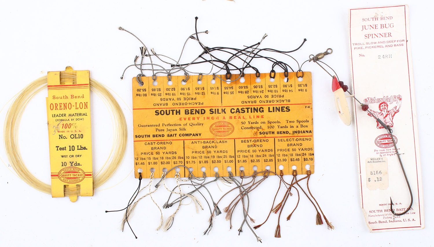 Lot of Fishing Tackle, (1) South Bend Silk Casting Lines Sample, (1) South Bend June Bug Spinner, (1) South Bend Oreno-Lon 10lb test. Grade: Excellent - Value: 8 to 30