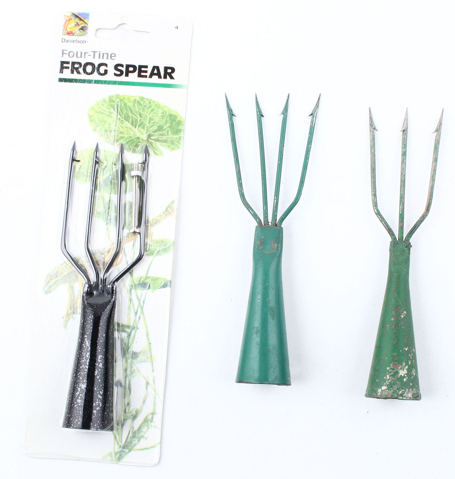 Lot of 3- Four Tine Frog Spears, one is NIB, one is 3-tine, loose spears have some normal wear. Grade: Excellent - Value: 10 to 40
