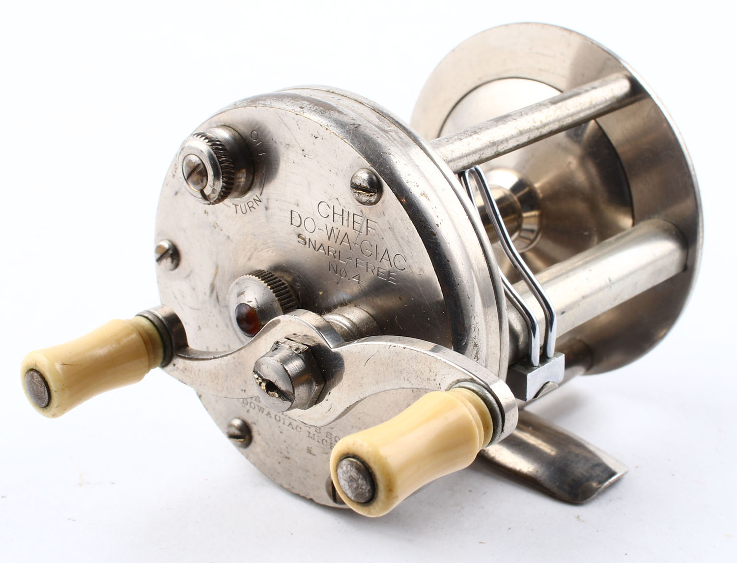 James Heddon's Sons Chief DO-WA-GIAC Snarl Free No. 4, dual handle, marked on right side plate & bottom of reel seat, strong click, smooth reel turn. Grade: Excellent - Value: 10 to 50