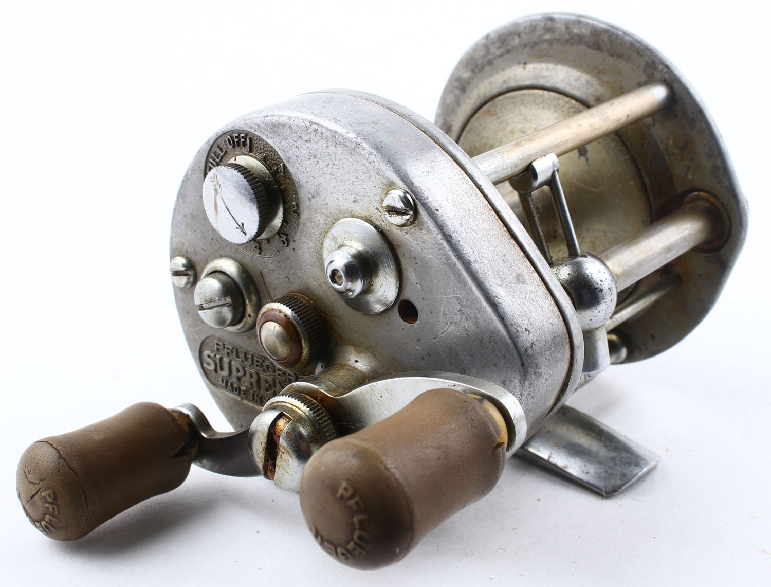 Pflueger Supreme, dual handle, handles have small cracks, marked on right side plate & bottom of reel seat, strong click, smooth reel turn. Grade: Very Good - Value: 6 to 30