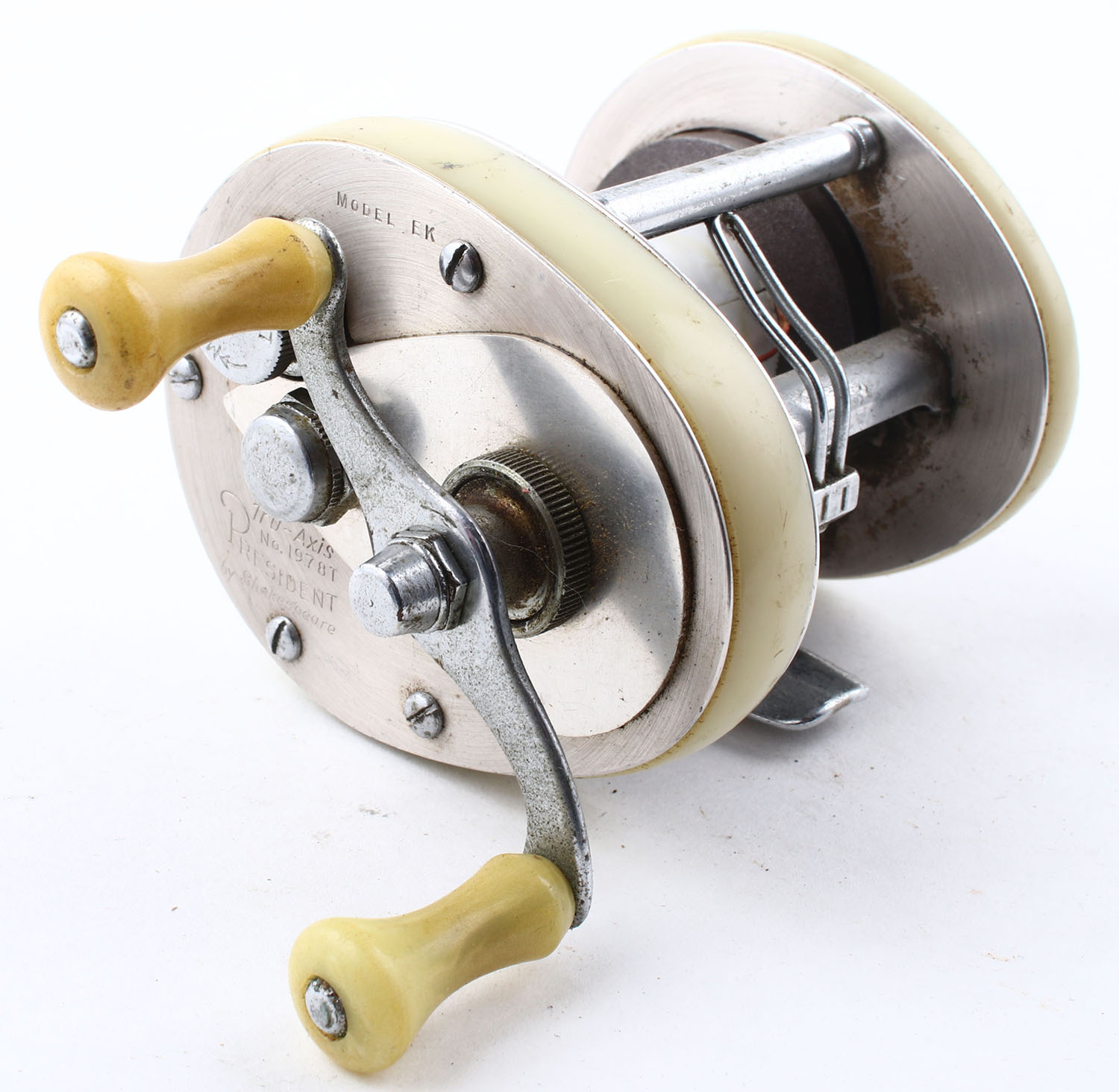 Shakespeare President True Axis No 1978T Model EK, dual handle, marked on right side plate, strong click, smooth reel turn. Grade: Very Good++ - Value: 10 to 50