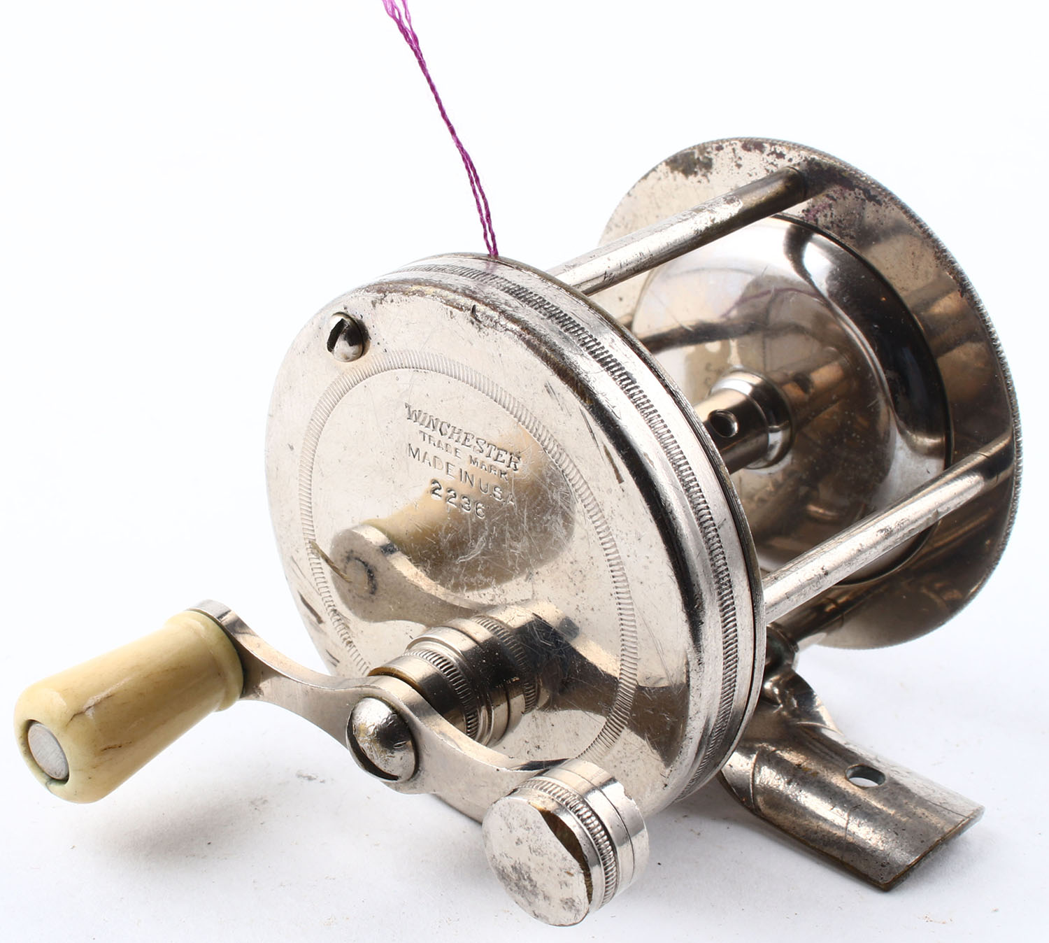 Winchester No. 2236, 60yd, single handle, marked on right side plate, strong click, inside discs are slightly wobbly, but still turns smooth. Grade: Very Good + - Value: 10 to 50