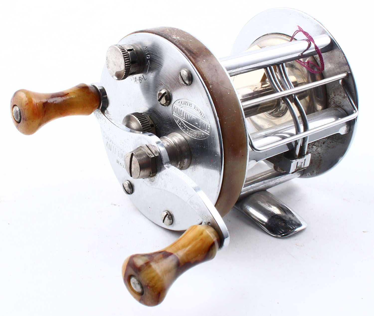 South Bend No. 450 Model E, dual handle, JWL, marked on right side plate & bottom of reel seat, strong click, smooth reel turn. Grade: Excellent+ - Value: 10 to 50