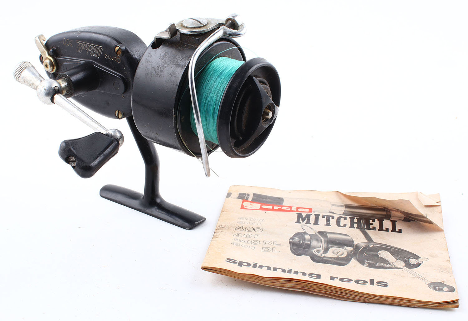 Garcia Mitchell 300, spinning reel, single handle, smooth reel spin, a small amount of resistance, comes with paperwork. Grade: Very Good - - Value: 10 to 50