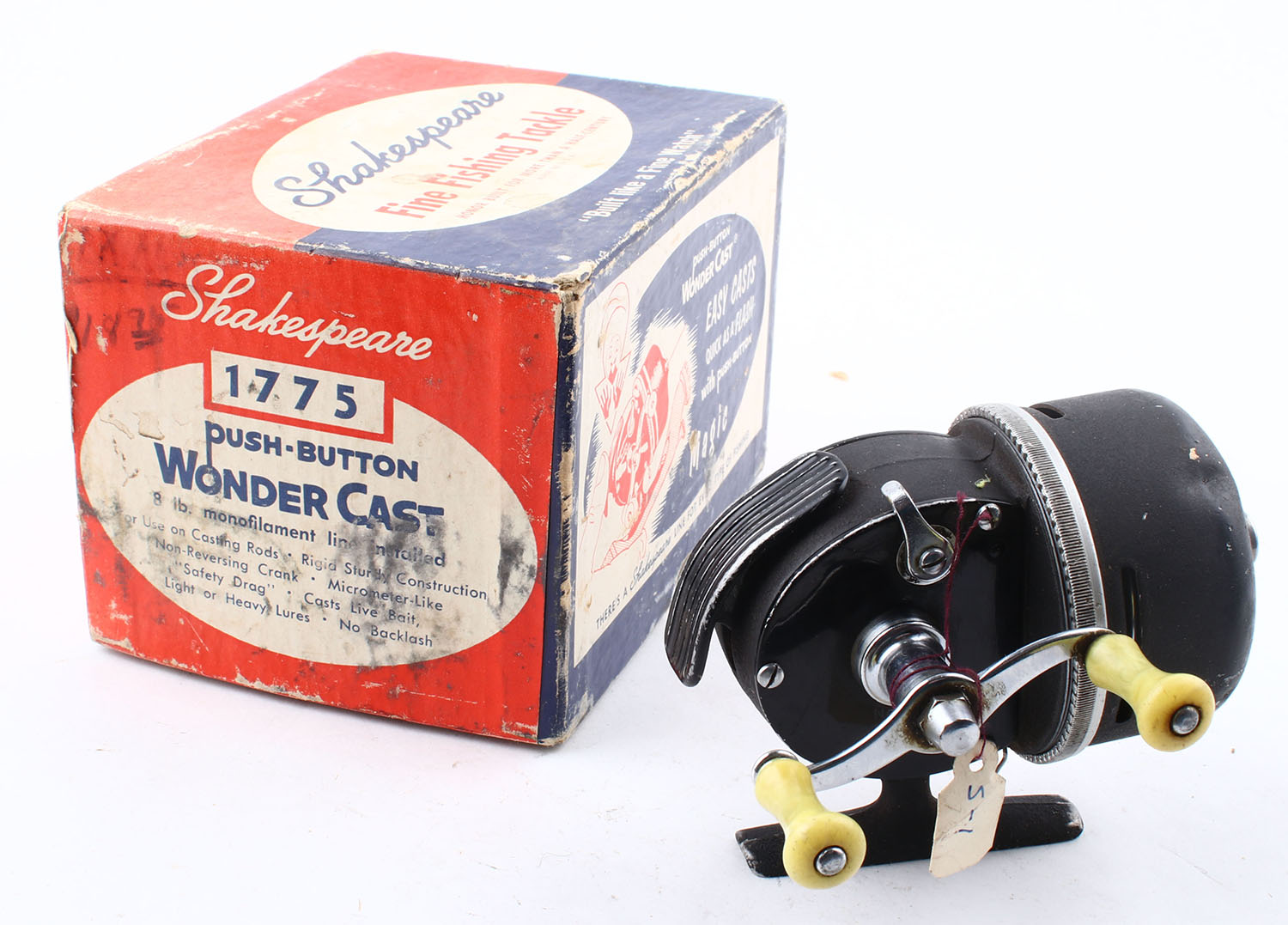 BOXED, Shakespeare Push Button Wondercast No. 1775, enclosed face, reel turn is tight with quite a bit of resistance, comes in original box, with paperwork & tool. Grade: Very Good - Value: 10 to 50