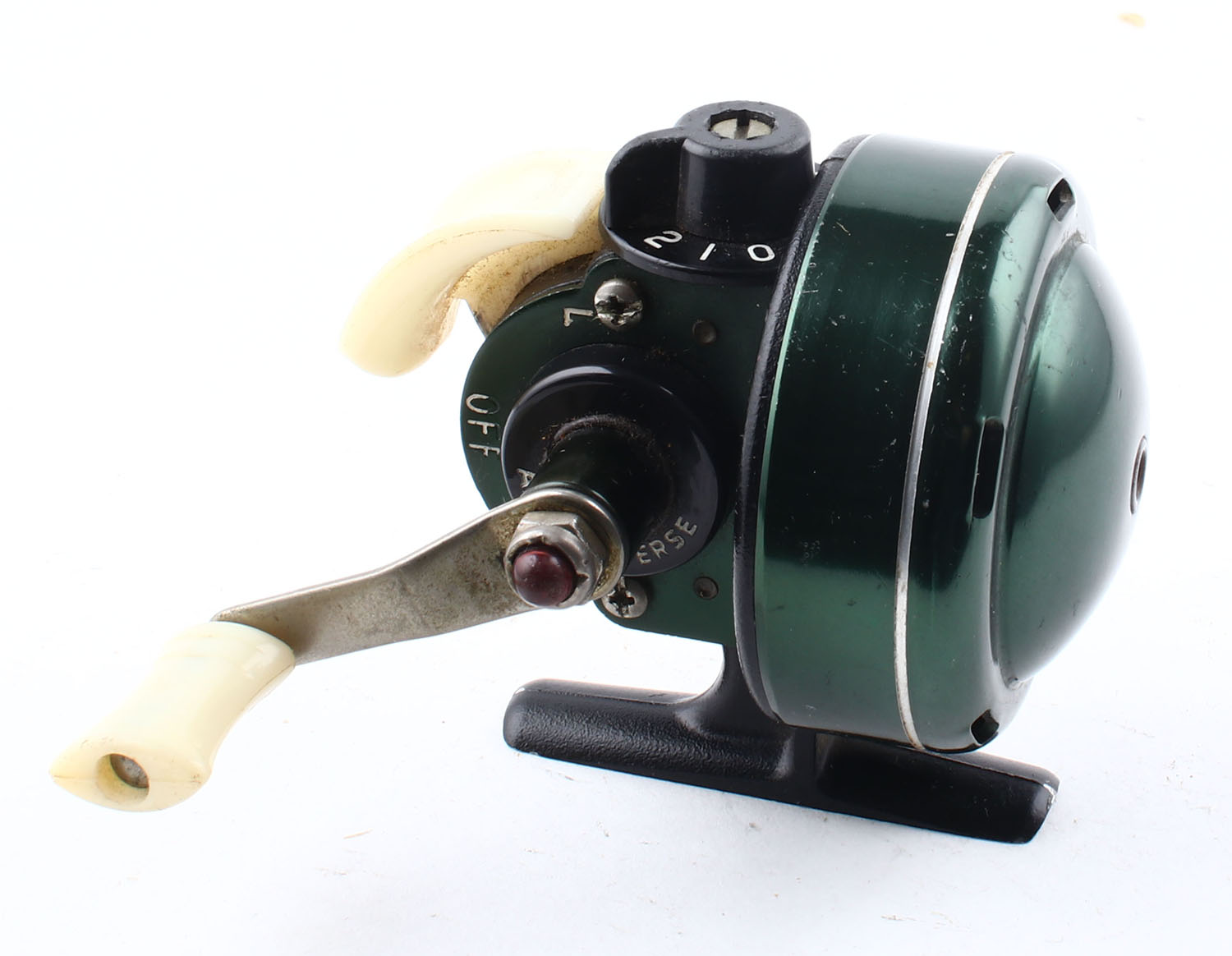 Johnson Century Model 100B, push button, enclosed face spinning reel, single handle, light clicks, smooth reel turn. Grade: Very Good - Value: 6 to 30