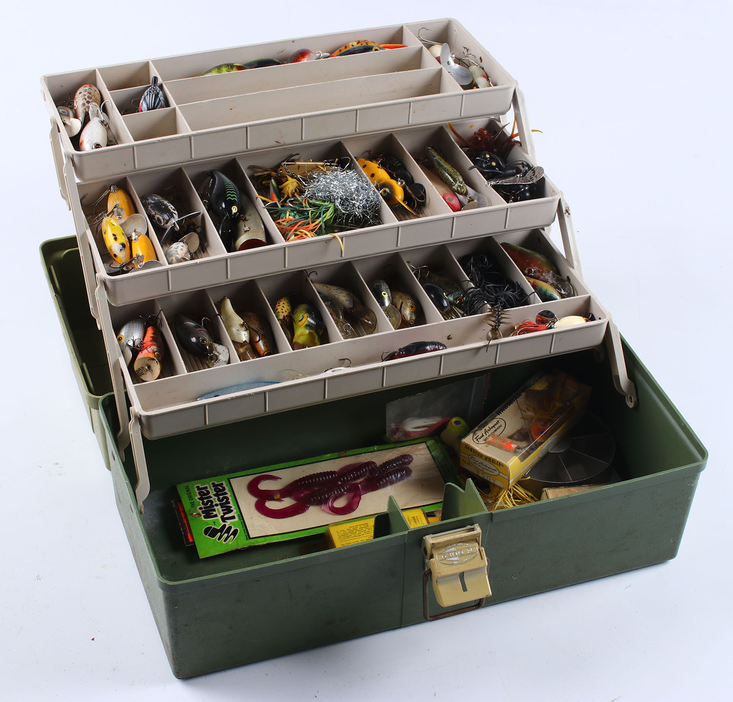 Plano Model 6300 N, plastic tackle box, with an assortment of fishing tackle. Grade: Very Good - Value: 10 to 50