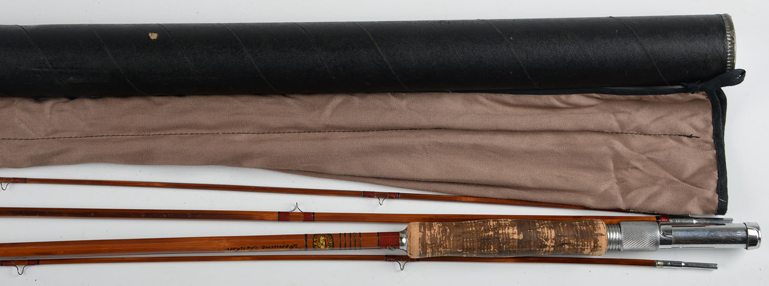 Montague Tonkin Fly Rod, 8'6'', 4/2, red agate eyelets, cork handle has been fished, comes in cloth carrying case & period correct cardboard tube. Grade: Excellent - Value: 10 to 50