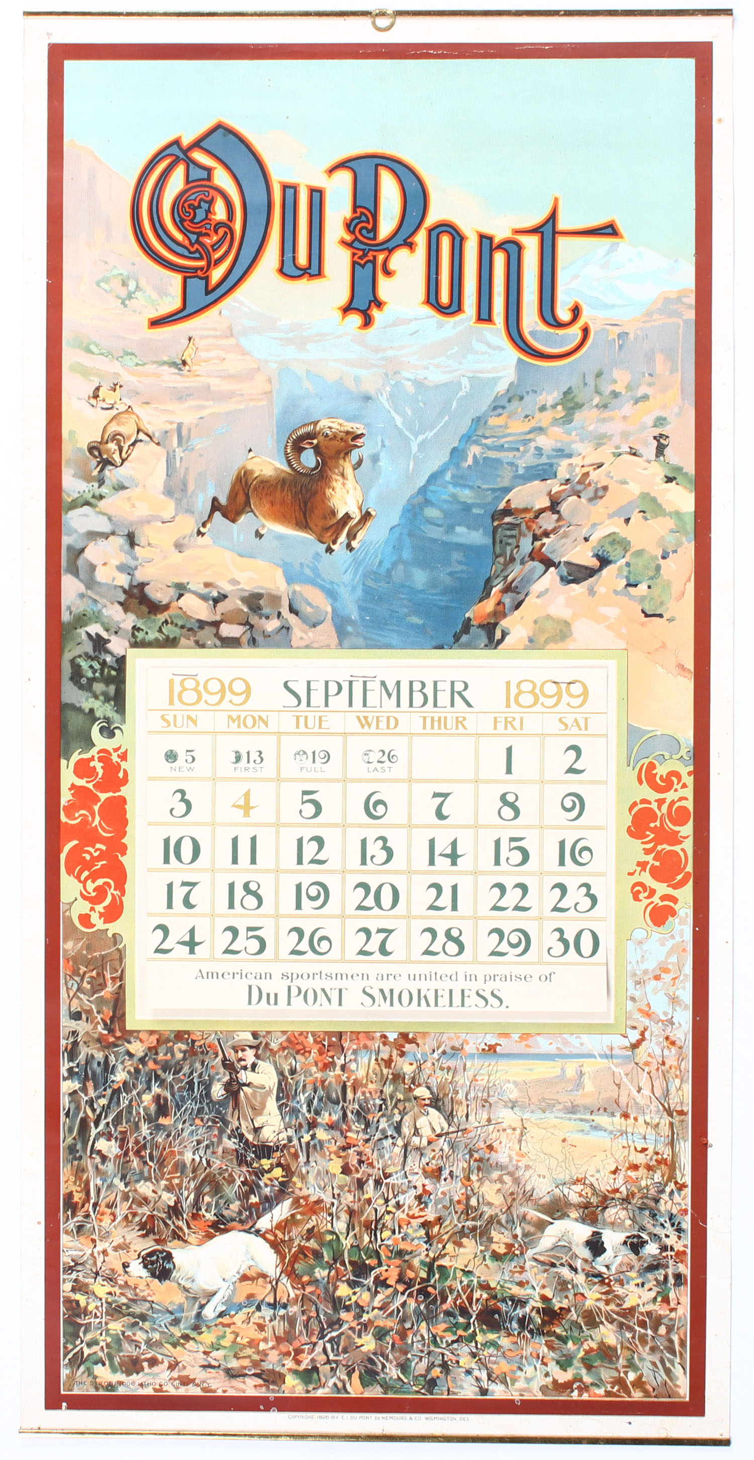 Extremely Rare 1899 DUPONT Calendar, wonderful full color image of big horn sheep hunting scene at top with fall upland bird hunting scene at the bottom, Sept. Page, has metal bands top & bottom with brass hanger, all edges are excellent with four very small holes in each corner, colors are fantastic, one of the best we have seen & the first we have offered, 13 1/2'''' x 28 1/4'''', Very Rare! Grade: Excellent + - Value: 8000 to 15000