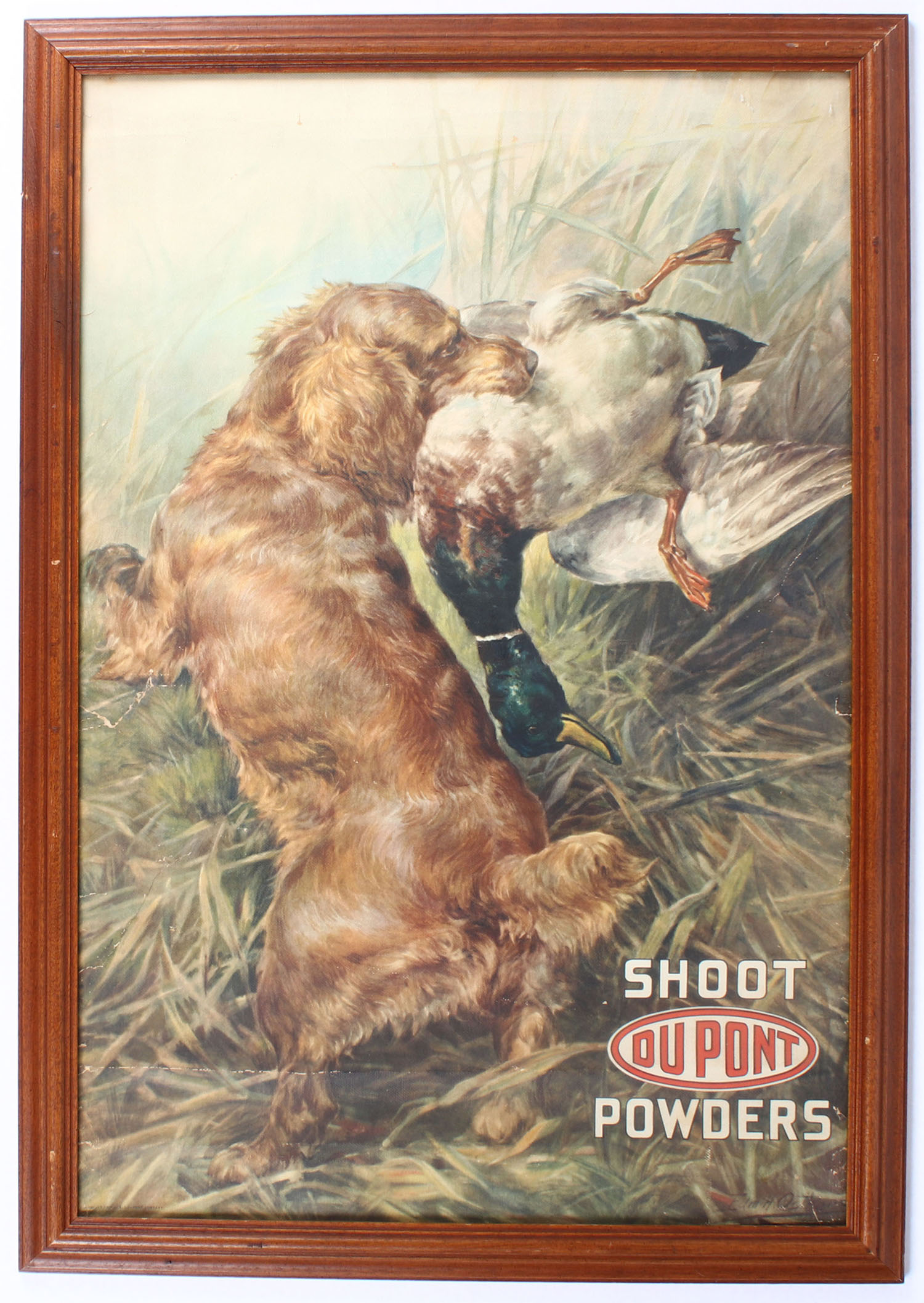 1904 Dupont Poster, ''SHOOT DUPONT POWDERS'', has great full color image of golden retriever with duck in its mouth, in marsh grass, 20'' x 30'', has brass bands & brass hanger, has edge wear, tears on the left side, one with a small tape repair, a couple roll creases on the bottom & two light creases on the top, has very nice colors, har d to find, framed. Grade: Very Good++ - Value: 1500 to 3000