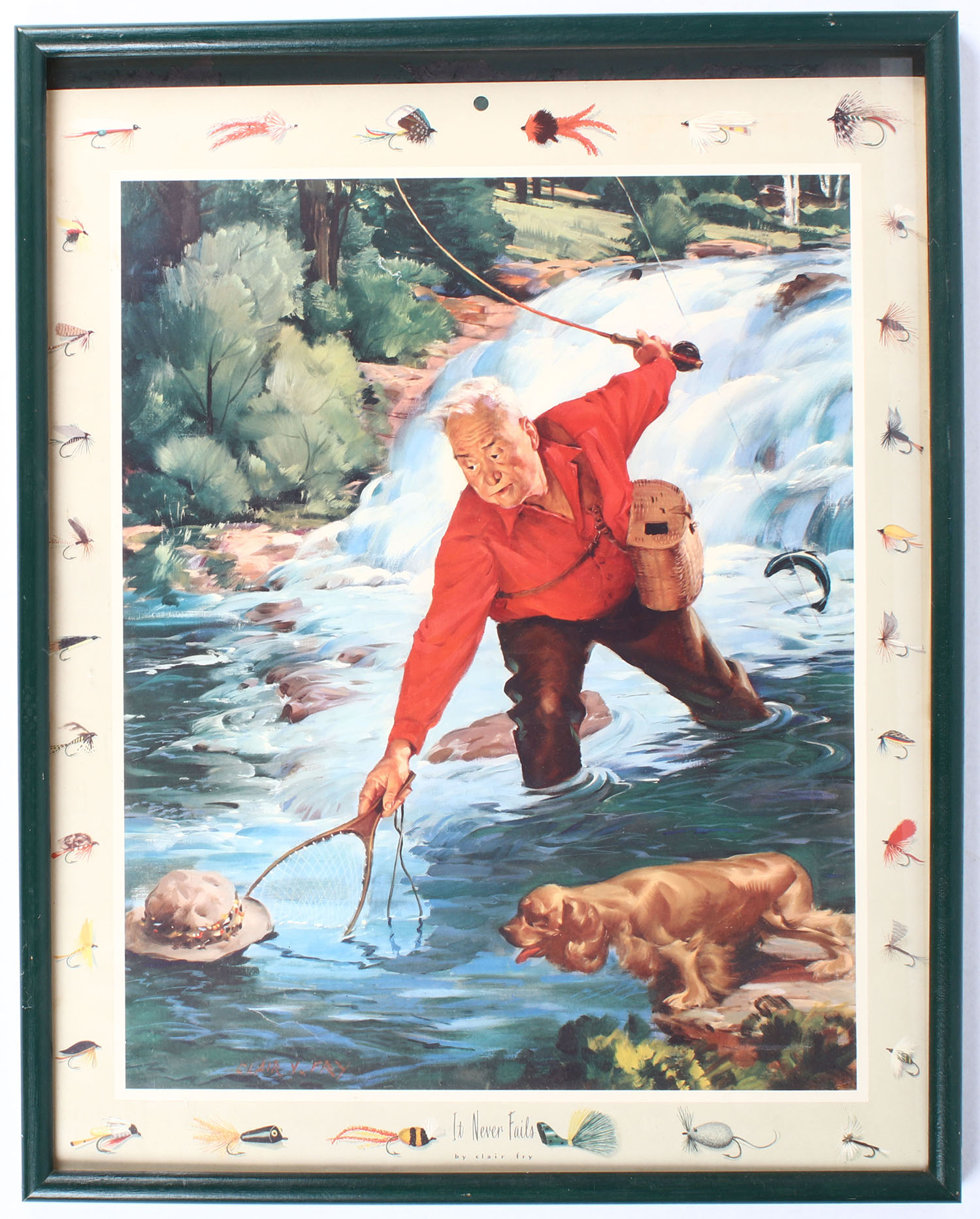 Fly Fishing Poster IT NEVER FAILS by Clair Fry, pictures a fisherman trying to retrieve his hat with a net as the dog looks on, the border has many colorful flies, 22'' x 28'', framed. Grade: Excellent - Value: 40 to 200