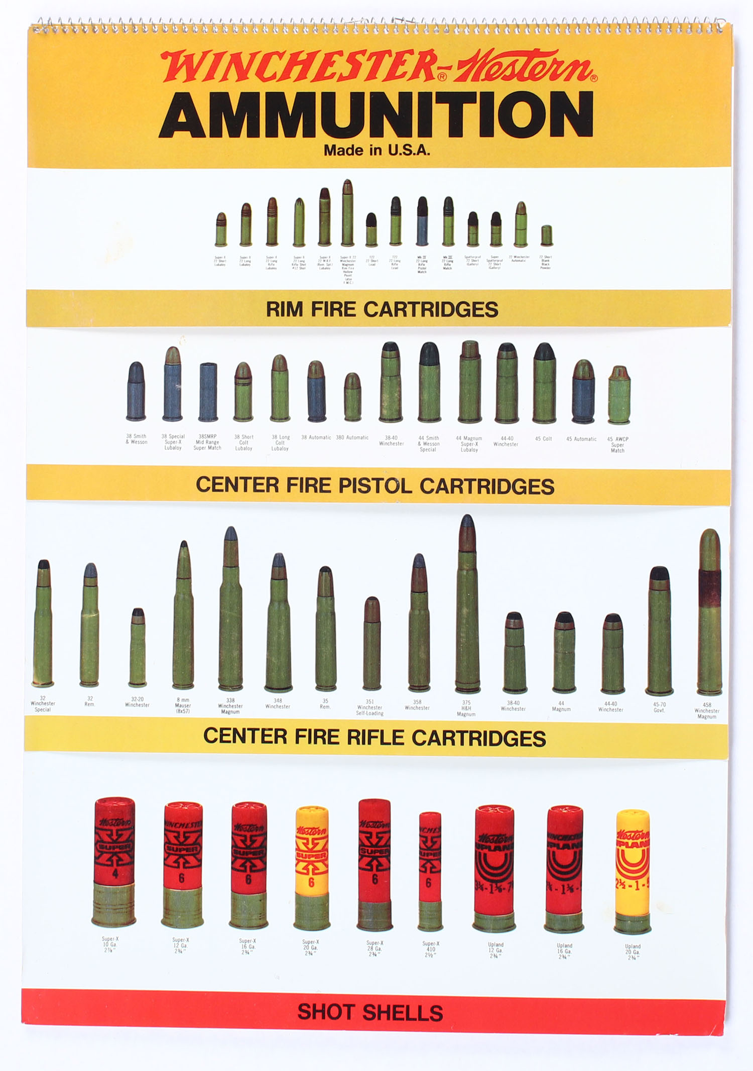 Winchester Ammunition diecut, pictures all Winchester cartridges & shotshells, flip-up tabs have cartridge info on back side, excellent colors, slight bend to the edges, otherwise excellent. Grade: Excellent+ - Value: 20 to 80