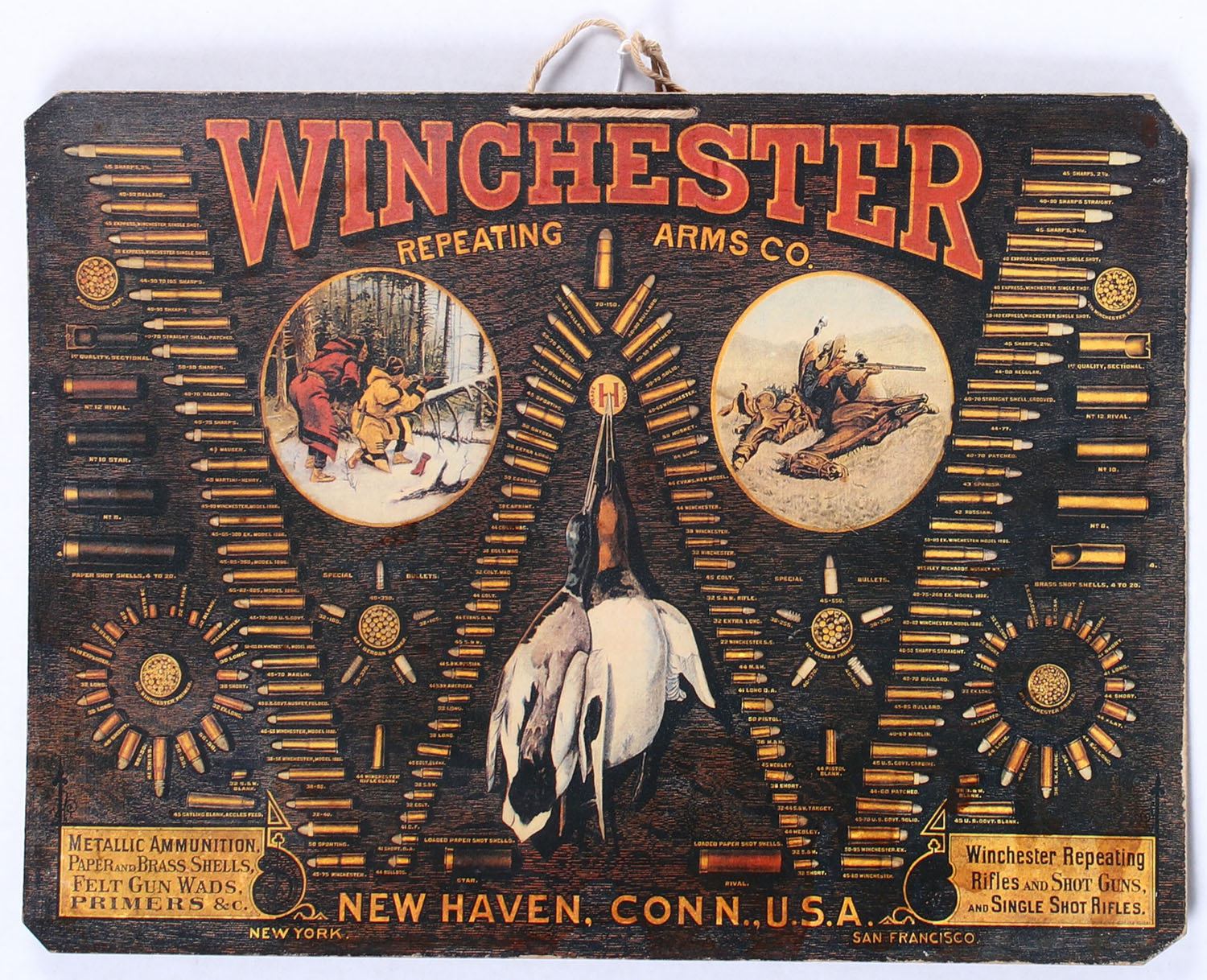 Winchester Repeating Arms Co. Single ''W'' Cartridge Board Diecut, pictures all the Winchester cartridges in a ''W'' formation, shotshells on the sides/bottom, special bullets in a circular pattern & primer tins, two game scenes, two hanging ducks & address along bottom edge, has great colors, light edge wear & slight curve. 13 1/4'' x 10 5/8''. Grade: Excellent + - Value: 20 to 80