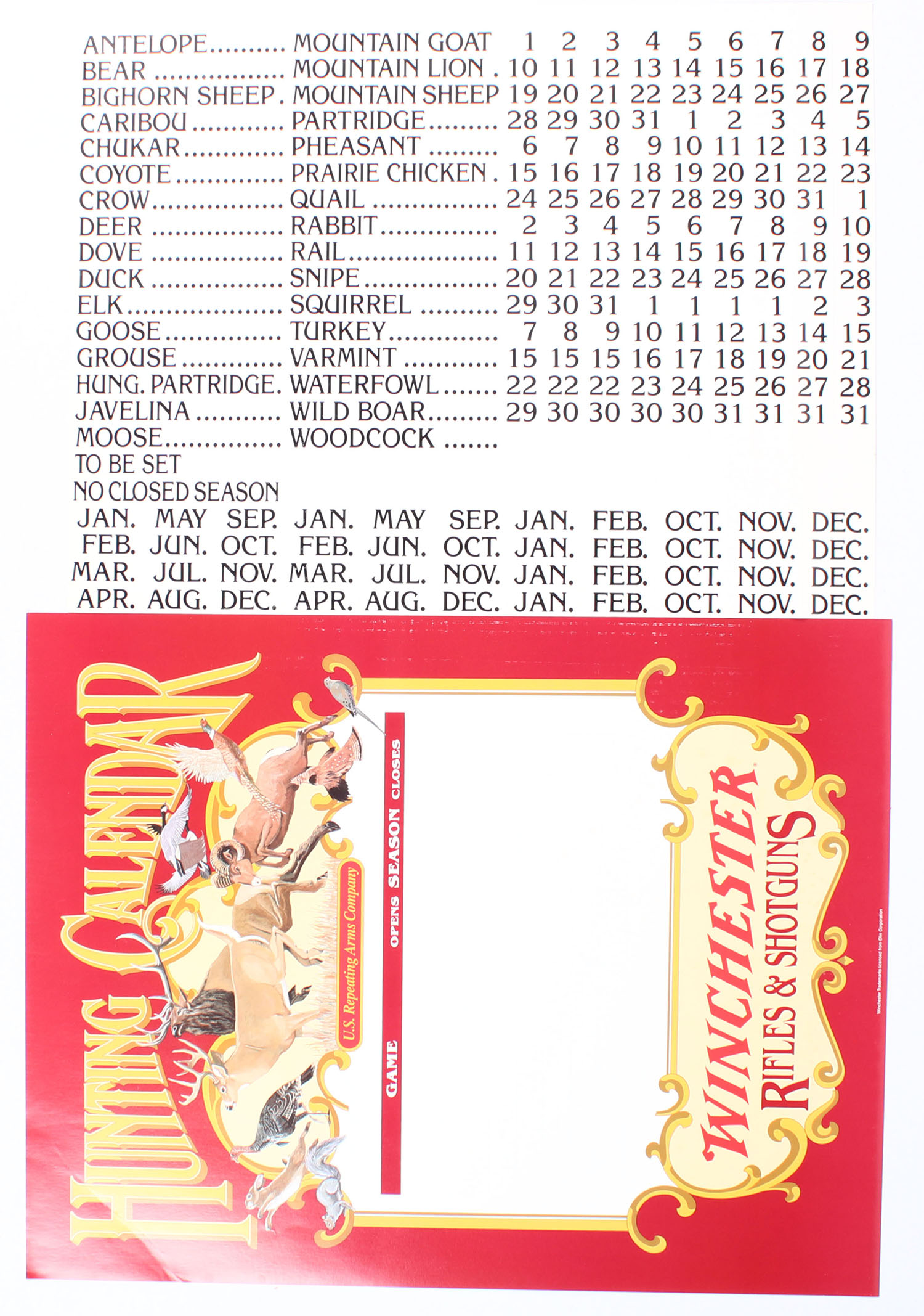 U.S Repeating Arms Co./Winchester Hunting Calendar, you can create your own hunting season calendar with the type of animal & open/closing dates of season, pictures full color images of a variety of game animals, Winchester Rifles & Shotguns banner on bottom, outstanding & crisp colors, light age spotting & light rub wear to the right side, comes with a full sheet of animals. 28'' x 22''. Grade: Excellent - Value: 20 to 100