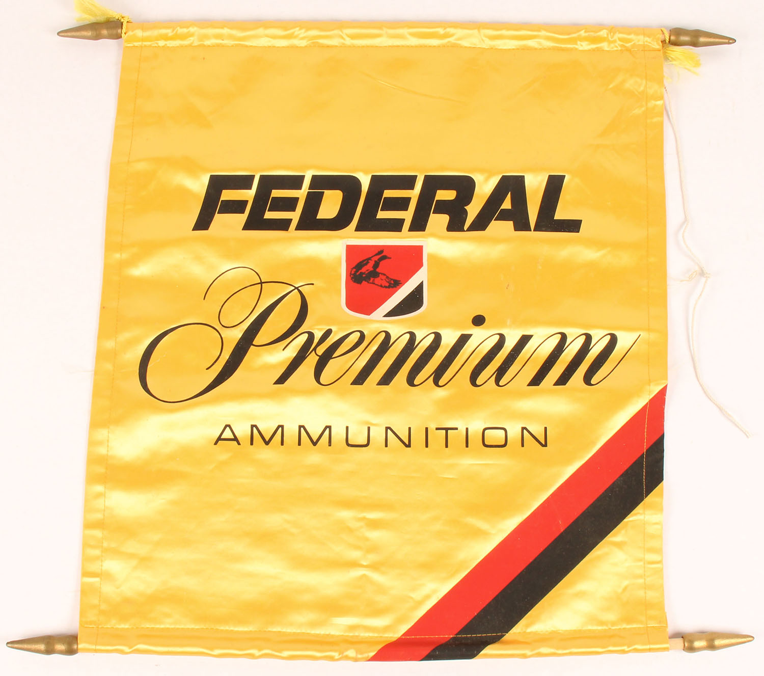 Federal Banner, ''FEDERAL PREMIUM AMMUNITION'', gold, red & black, has a few stain spots throughout, 20'' x 23''. Grade: Very Good - Value: 10 to 60