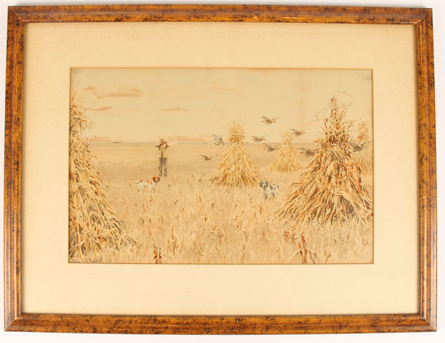 A.B Frost ''QUAIL HUNTING'' Print, pictures a man & two dogs hunting a covey of quail, has original mat which print is fixed to, framed 28'' x 21''. Grade: Excellent - Value: 20 to 200