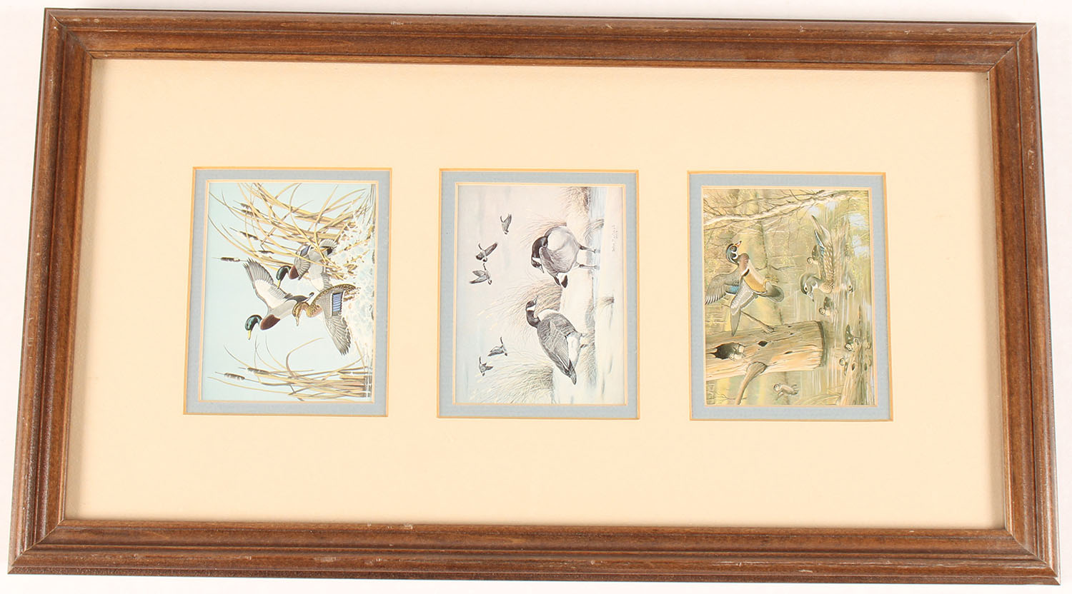 John MacLeod 1977, pictures three separate full color images of wood ducks, Canadian geese & mallard ducks, framed, 10 1/2'' x 18 1/2''. Grade: Excellent - Value: 20 to 100