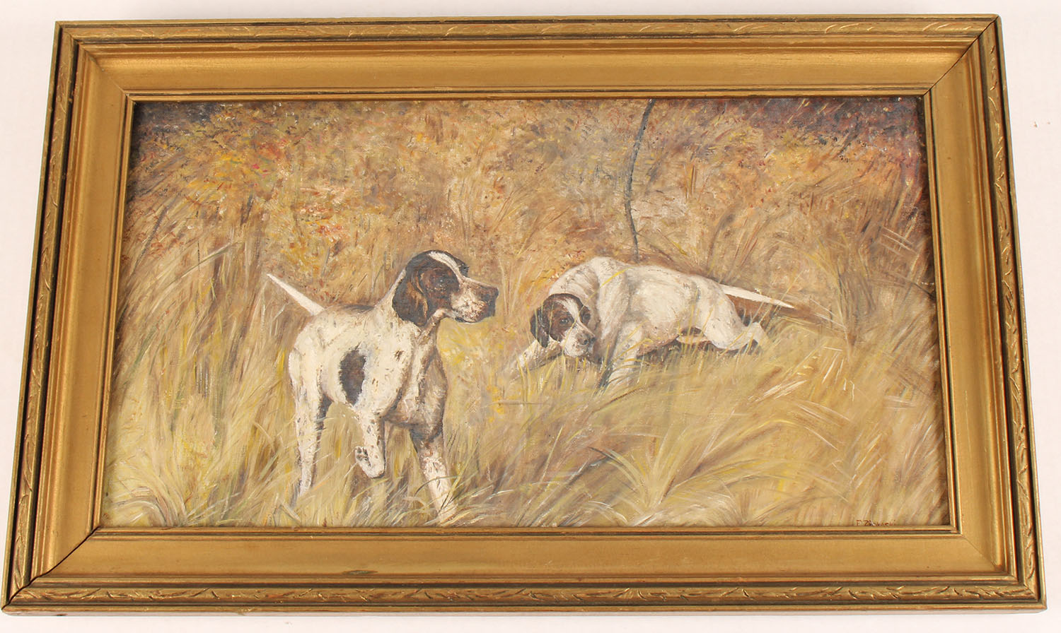 F. Ziokoski original oil on canvas, pictures two hunting dogs in a field, has good colors, framed, 22 5/8'' x 14''. Grade: Very Good - Value: 50 to 250