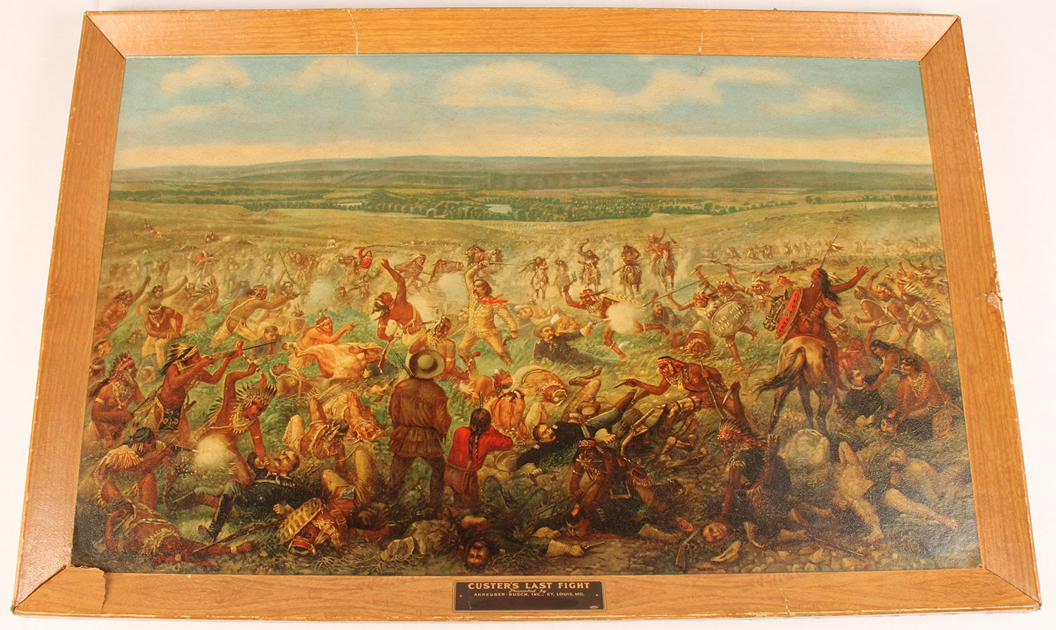 Custer's Last Fight by O. Beker, self framed image, pictures the battlegrounds of Custer's Last Stand, image size 38'' x 24'', made of diecut material, a few tears on the outer frame. Grade: Good + - Value: 20 to 80