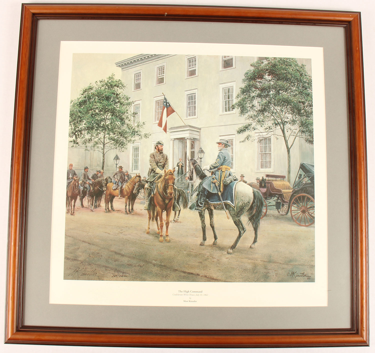 Civil War Print by Mort Kunstler, ''THE HIGH COMMAND'', Confederate White House July 13 1862, full color image of generals on horseback, 284/300, image size 19 1/2'' x 18'', framed. Grade: Excellent ++ - Value: 20 to 100