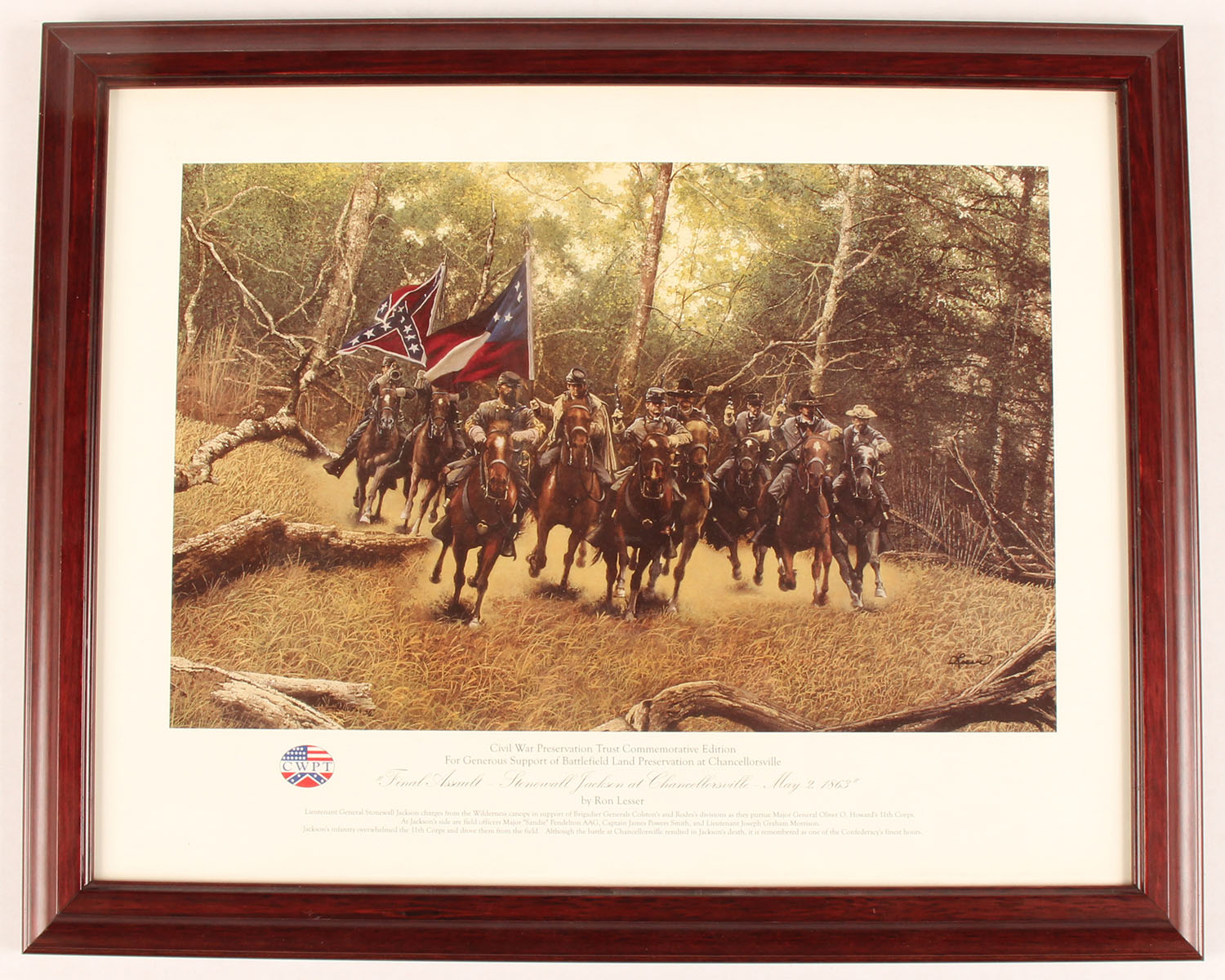 Print of Final Assault - Stonewall Jackson at Chancellorsville, May 2, 1863, by Ron Lesser, image size 13'' x 8 1/2'', framed. Grade: Excellent - Value: 10 to 50
