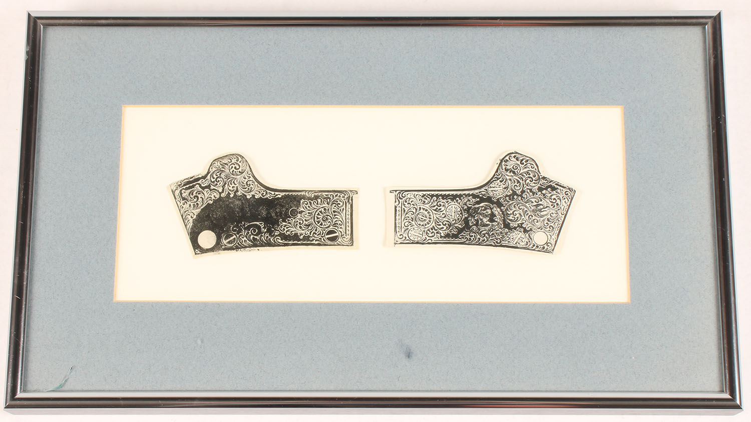 EXTREMELY RARE Set of Original engraved Remington Hepburn Indian Ink Pulls by Famous firearms engraver Louis Daniel Nimschke. At one point, Nimschke's personal album containing the original ink pulls from many of his engraved masterpieces was owned by Cody Firearms Museum curator Herb Houze. In recognition to renowned author, firearms historian & long time President of the Remington Society, Roy Marcot, Houze removed these two original Remington Hepburn ink pulls & gifted them to Roy. Images of these same two pulls are found in R.L. Wilson's book L.D. Nimschke Firearms Engraver. Original Nimscke ink pulls are extremely rare in public circulation or private collection, as his albums of the majority of original pulls now reside in museums. Framed, 14 1/2'' x 8 1/2'', with personal hand written letter from Herb Houze to Roy Marcot found on the rear side. Grade: Excellent+ - Value: 500 to 1500