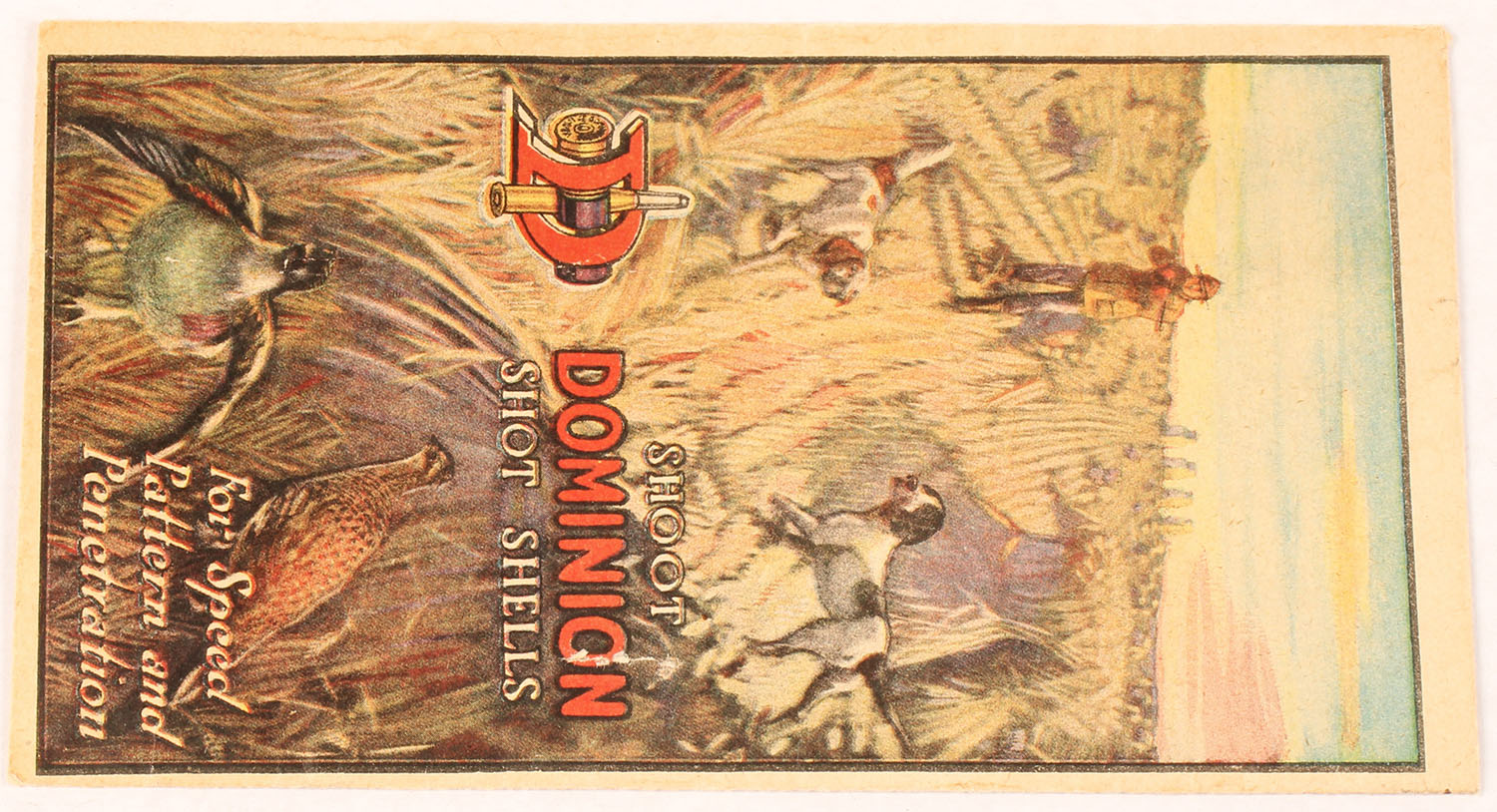RARE, Dominion Ammunition Envelope, ''SHOOT DOMINION SHOT SHELLS'', bent ''D'' logo, unused, no date, wonderful full color image of a bird hunting scene, bent ''D'' logo on both sides., light age soiling. Grade: Excellent + - Value: 100 to 300