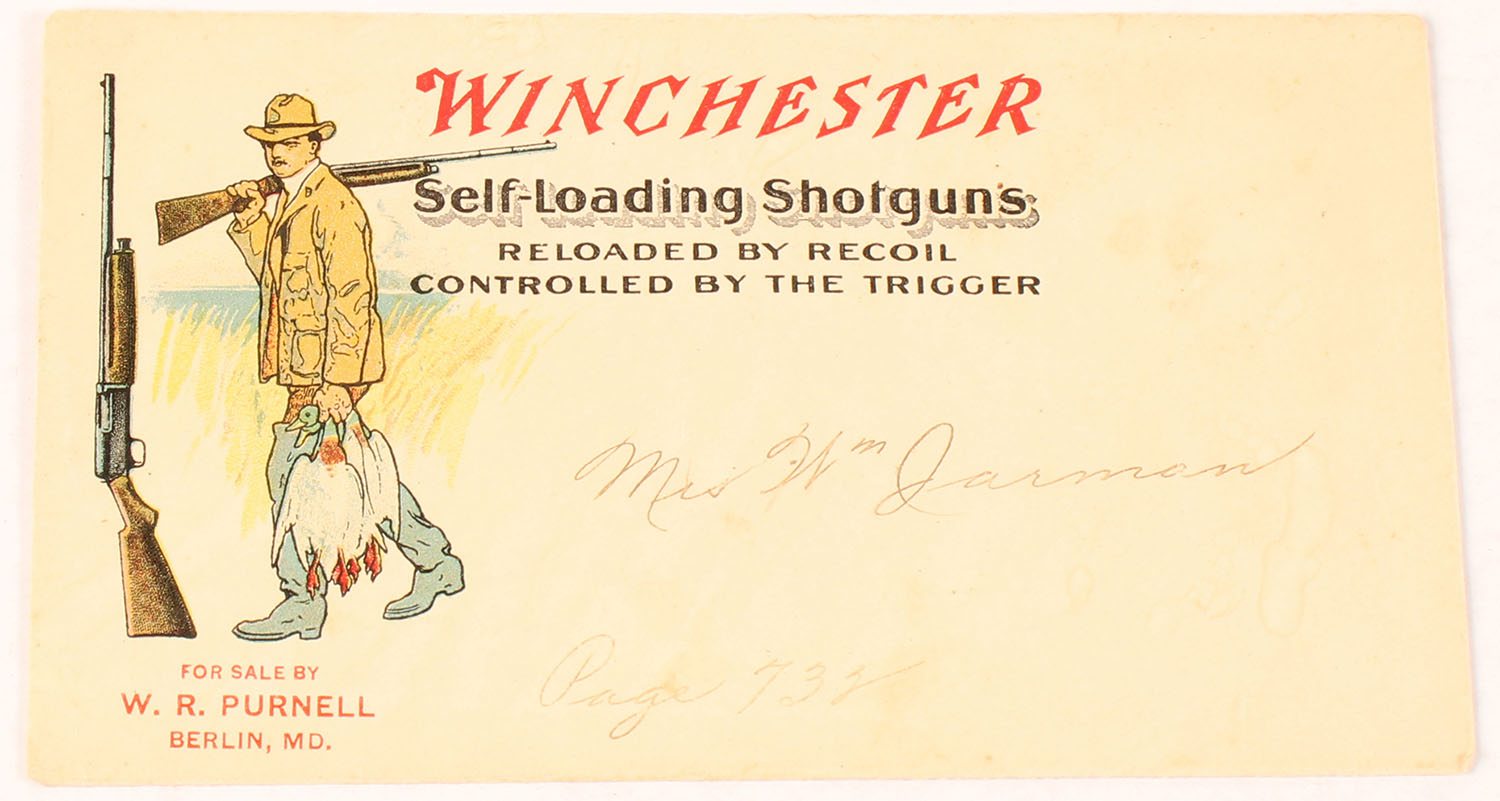 Winchester Self Loading Shotguns Envelope, ''RELOADED BY RECOIL CONTROLLED BY THE TRIGGER'', no date, has wonderful full color image of a hunter carrying ducks & a self-loading shotgun, light age soiling. Grade: Excellent - Value: 40 to 150