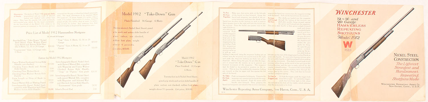 Winchester Model 1912 Hammerless Repeating Shotguns Brochure, has multiple tape repairs. Grade: Good - Value: 4 to 20