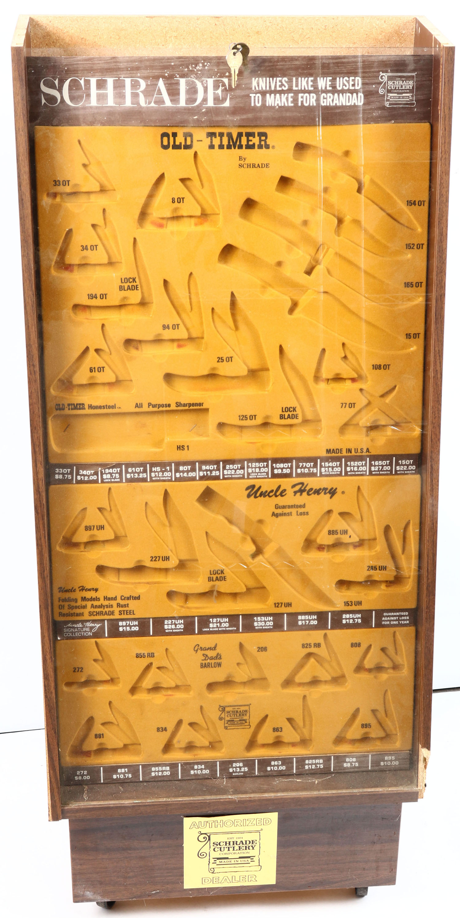 RARE! LARGE! Schrade wood and glass knife case, 20x47x15, on wheels, Empty with no knives in case, has keys, very nice case with many different spots to display knives. Missing top & has two corners with chips or breaks. Grade: Very Good - Value: 20 to 60