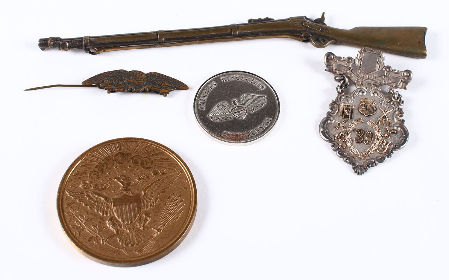 Lot of Military pins, medallions and a die cast Rem rolling block. Grade: Excellent ++ - Value: 40 to 100