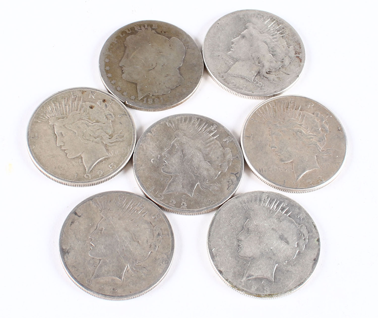 Lot of 7 silver dollars, 1 1891 Morgan silver dollar and 6 1920s Peace silver dollars, faded. Grade: Very Good - Value: 200 to 300