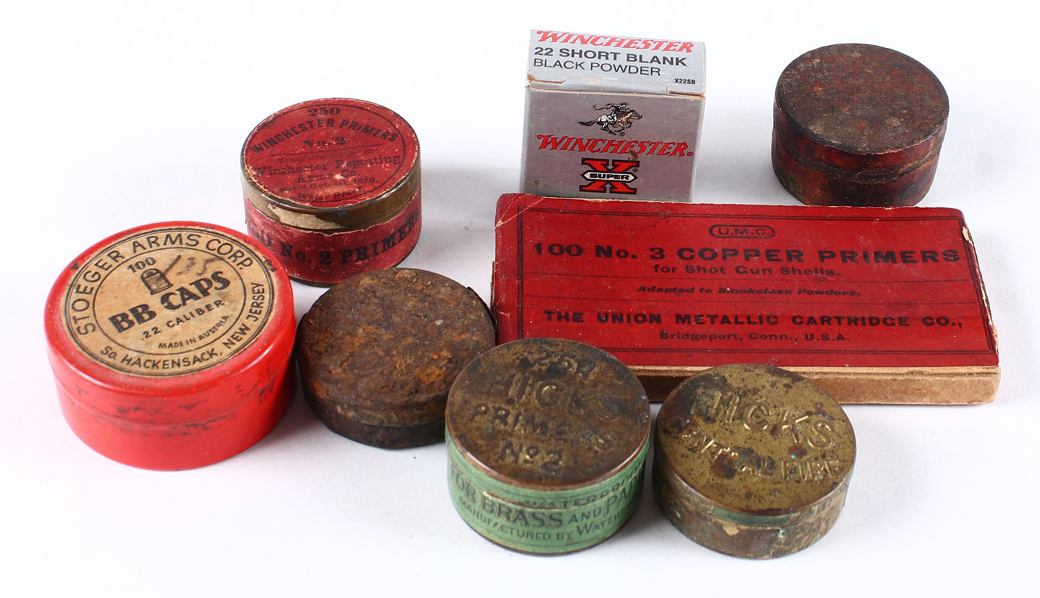 Lot of 8, Win 22 shot blanks, Stoeger arms corp BB caps and 6 primer tins/box, all partial. Grade: Very Good - Value: 4 to 40