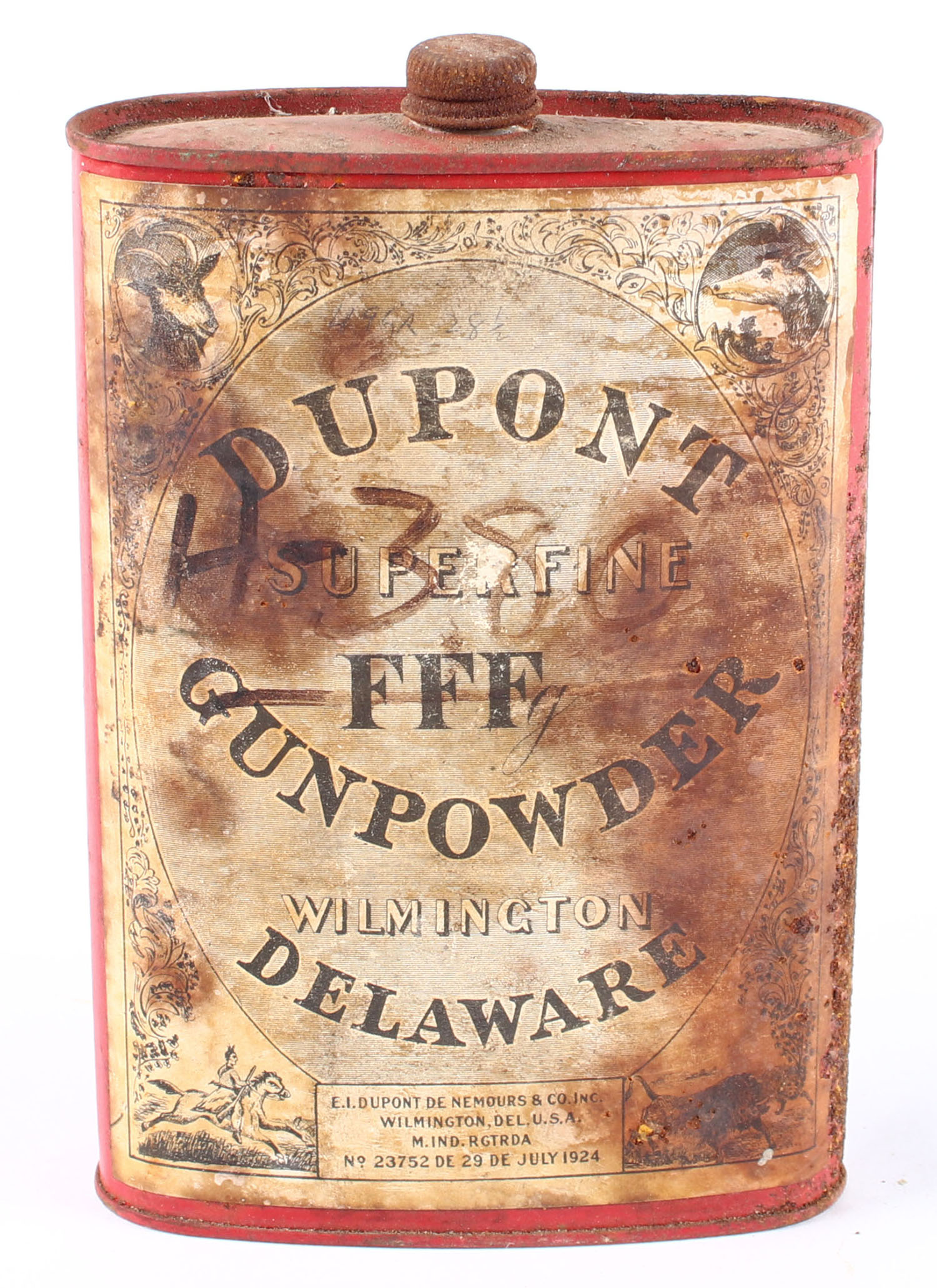 Dupont powder tin, Empty, FFFg, has age soiling and rust. Grade: Very Good - Value: 10 to 40