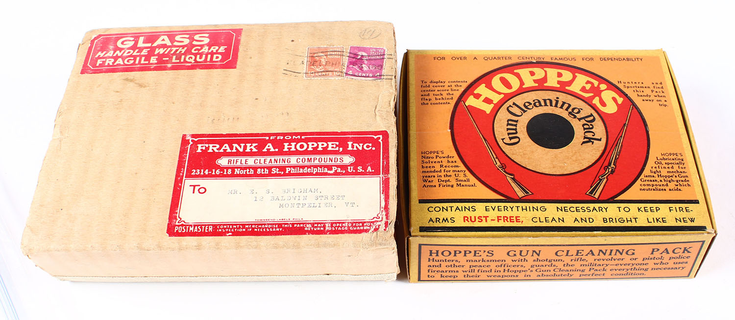 Hoppes Gun Cleaning Pack, Full & Complete with oil tin!, inside contents are bright and clean, oil tin is Full and outside box is very solid, bright and clean, with original cardboard shipping box. Grade: Excellent - Value: 50 to 250