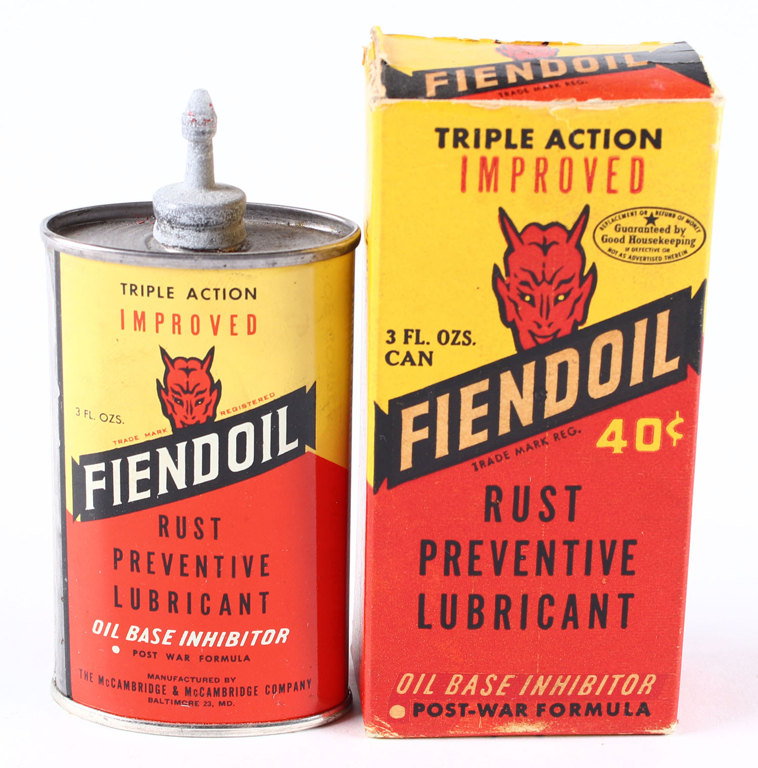 Fiendoil oil tin, lead spout and cap , FULL, in original cardboard box. Grade: Excellent - Value: 30 to 90