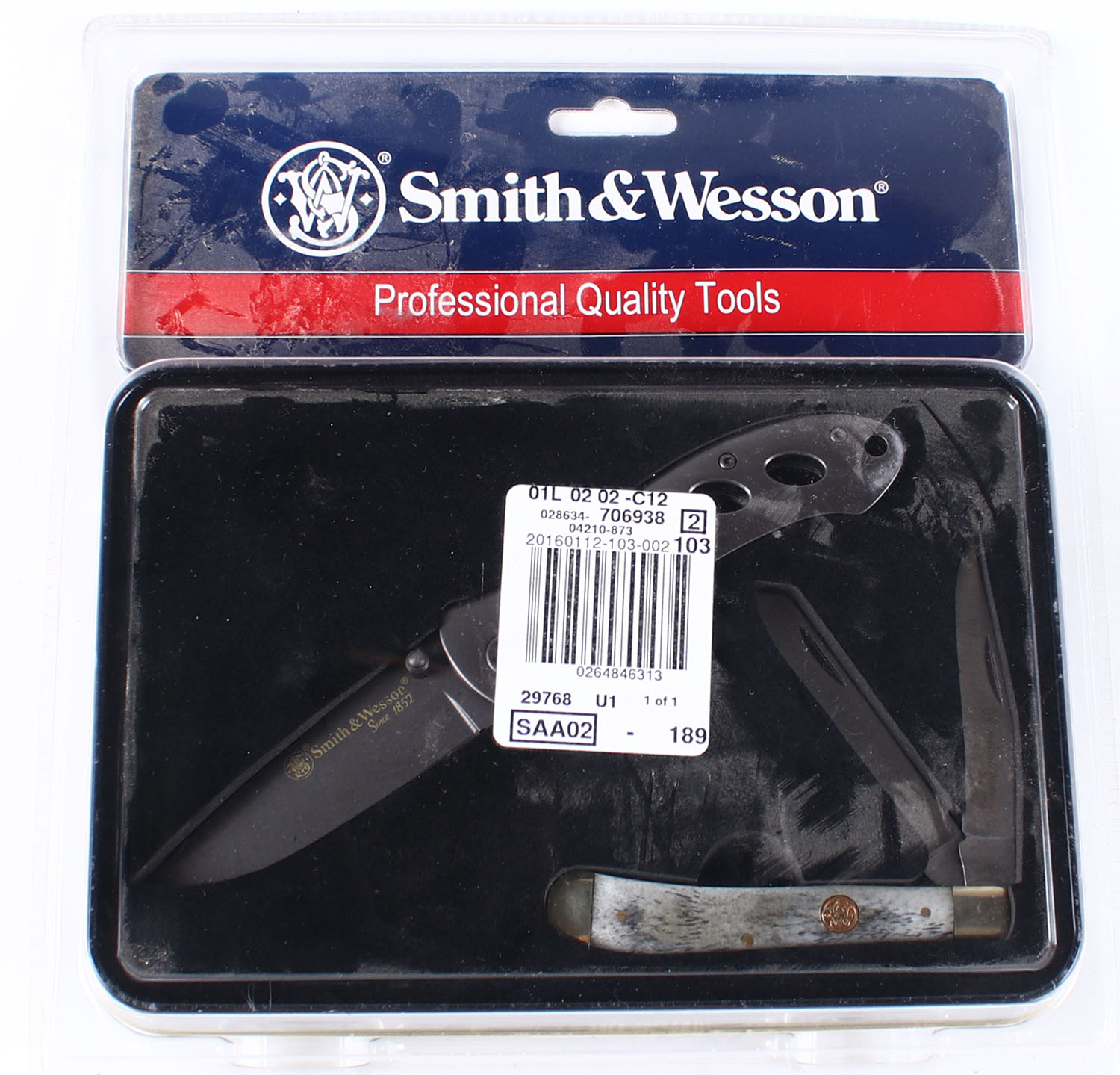 Set of S&W folding blade knives, in original case. Grade: Excellent ++ - Value: 50 to 100