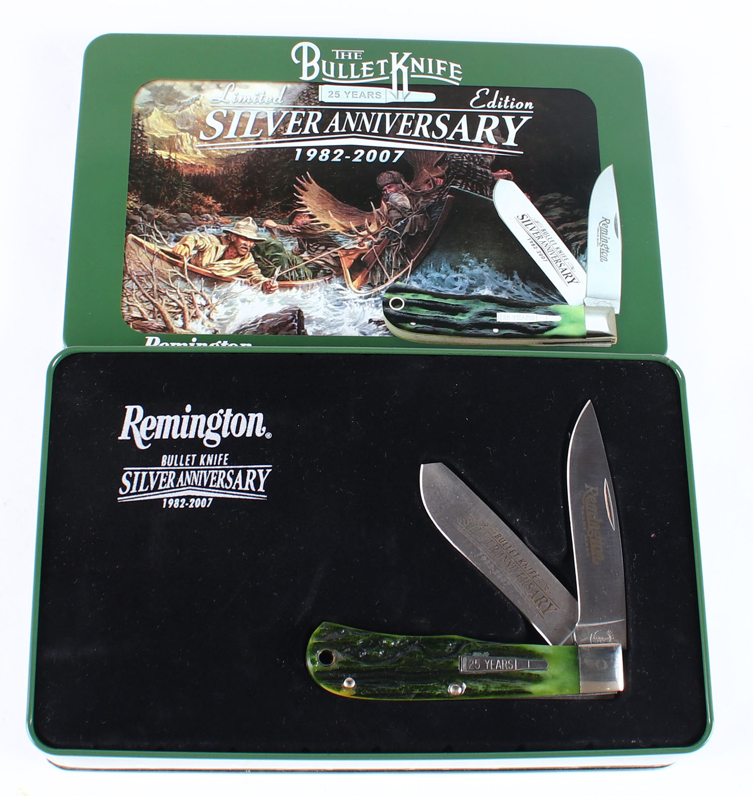 Remington Bullet knife, in original tin box, 25 years silver anniversary LE, 2 bladed folding knife, 3.5'' blades, has RSA certificate of authenticity. Grade: Excellent ++ - Value: 50 to 200
