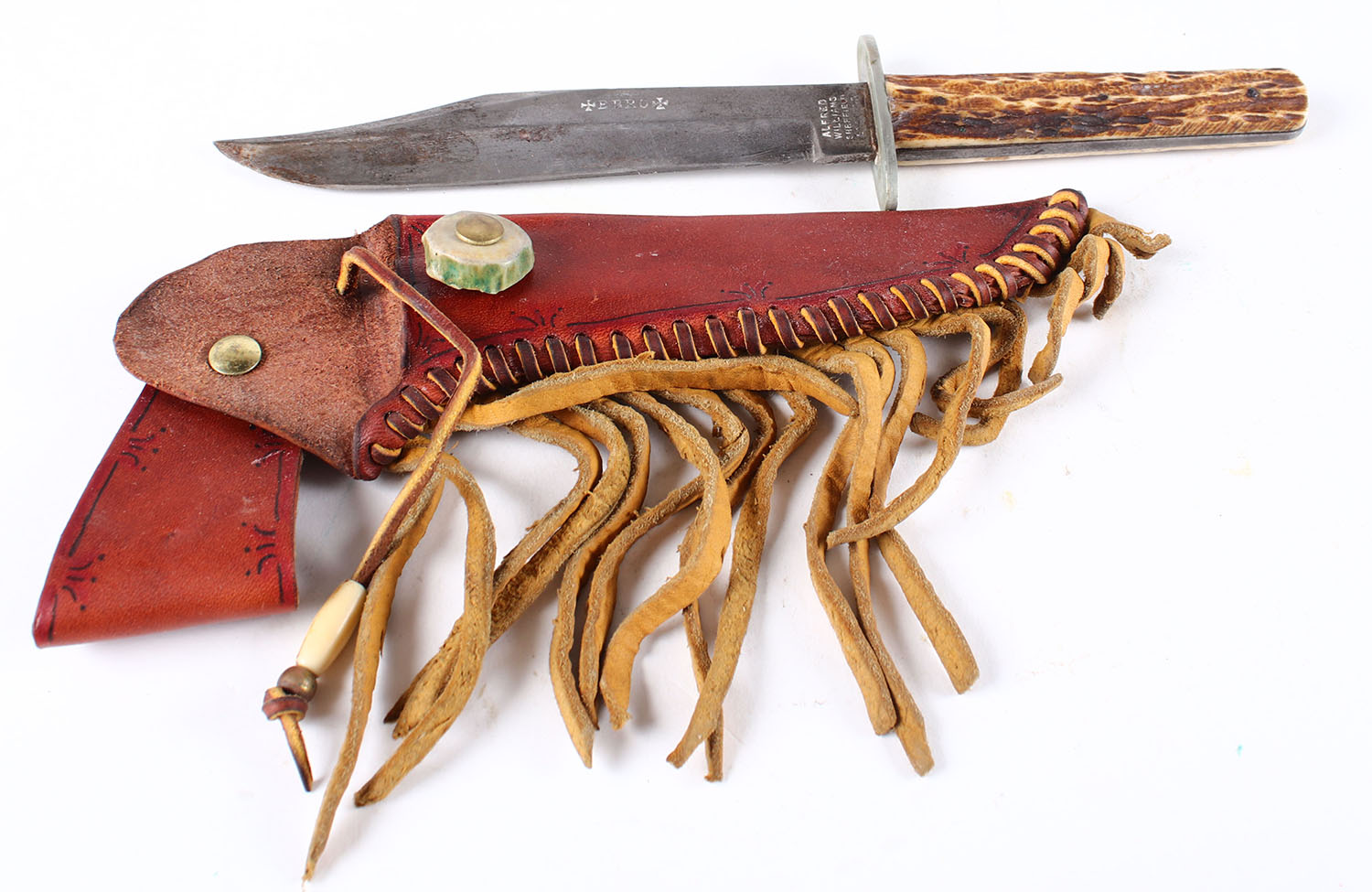 Alred Williams Seffield England knife, fixed blade, in original leather sheath, 6'' blade. Grade: Very Good ++ - Value: 50 to 200