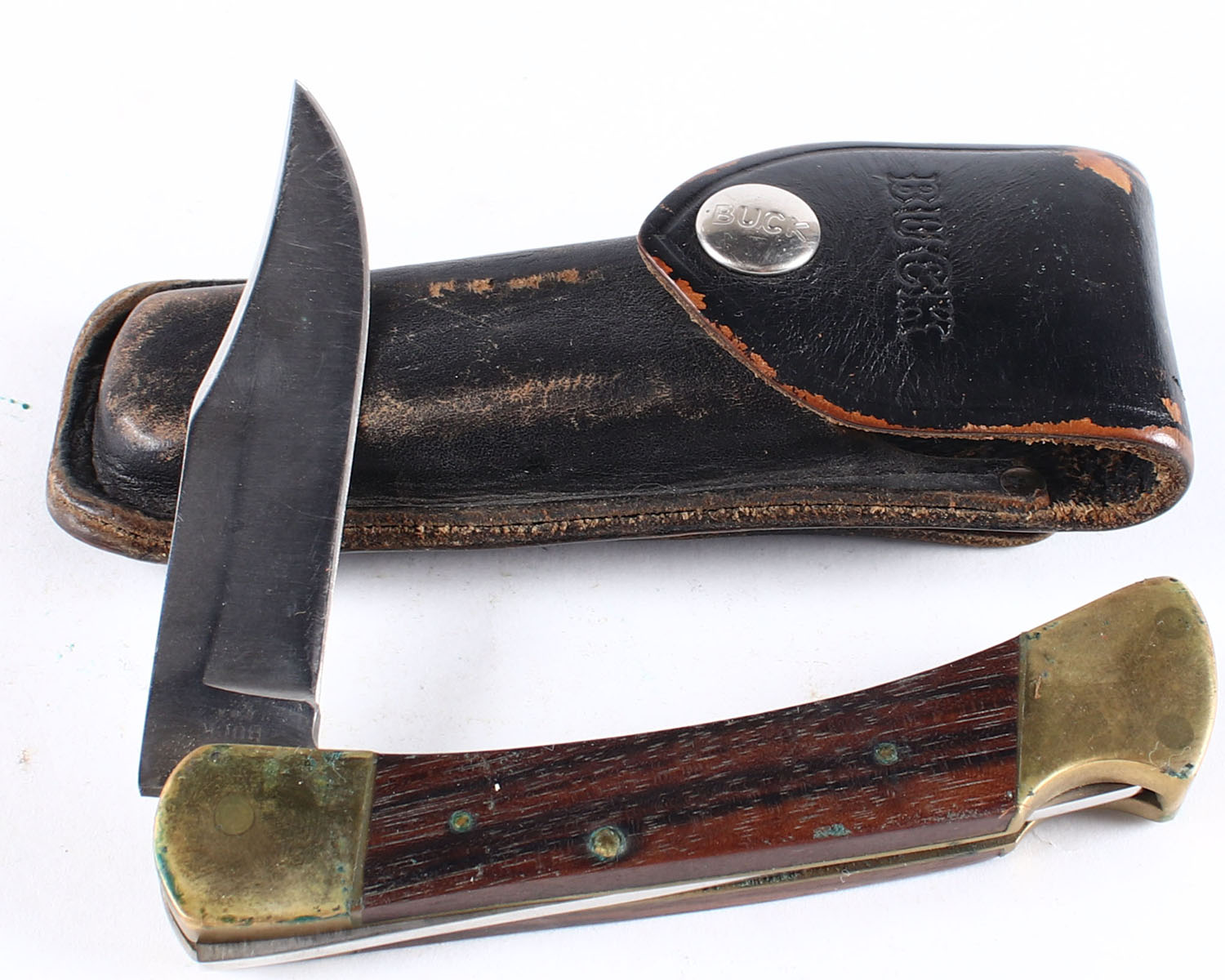 Buck knife, folding blade, has leather sheath, 3.5'' blade. Grade: Excellent - Value: 20 to 60