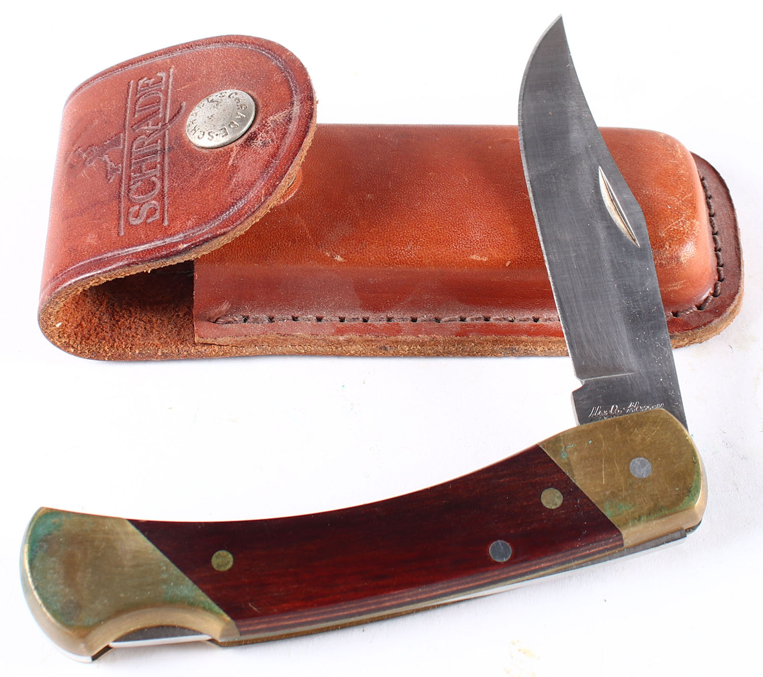 Schrade Uncle Henry knife, folding blade, has leather sheath, 3.5'' blade. Grade: Excellent - Value: 20 to 60