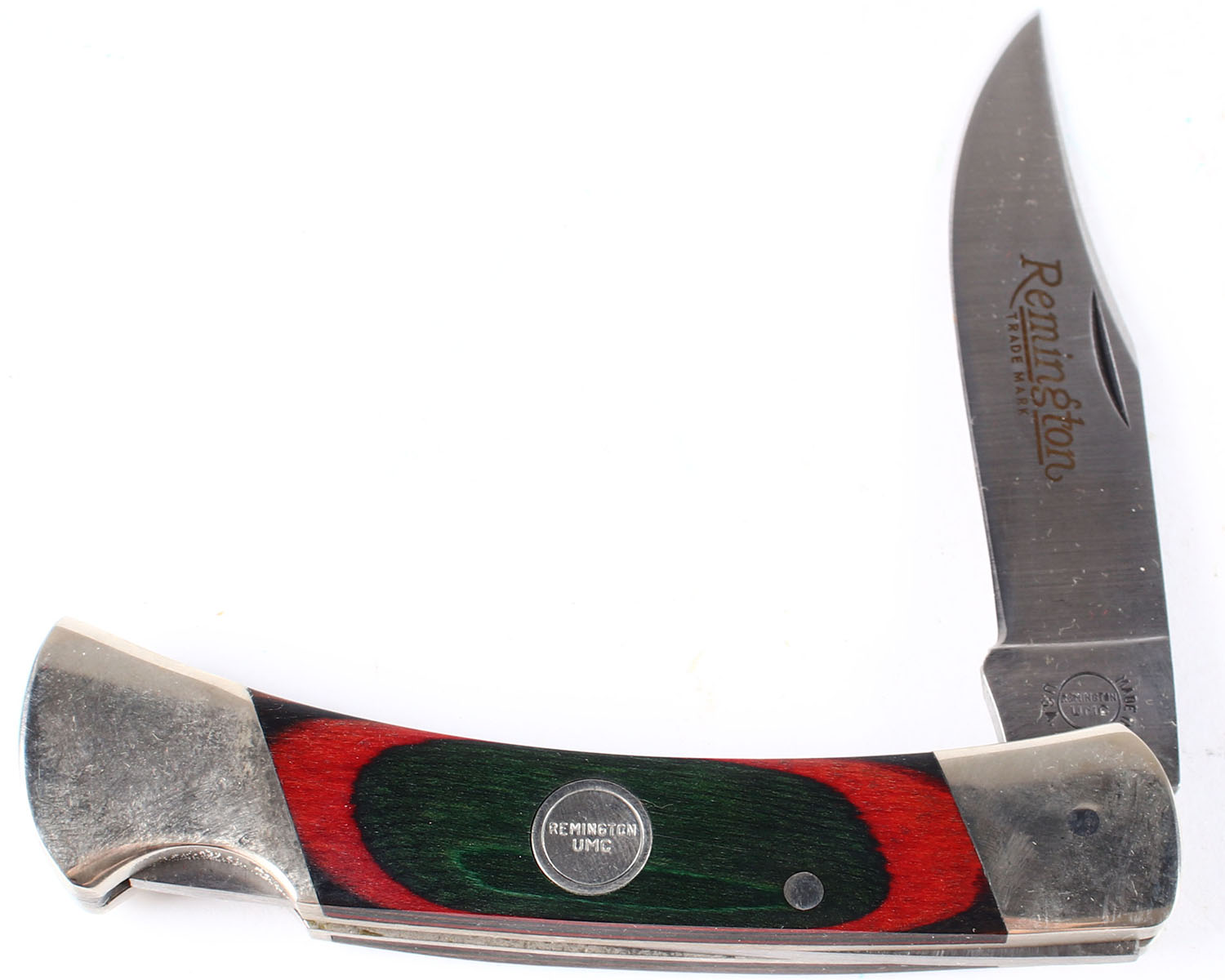 Remington UMC knife, folding blade, 4'' blade, 1994, multi colored wood handle. Grade: Excellent - Value: 40 to 100