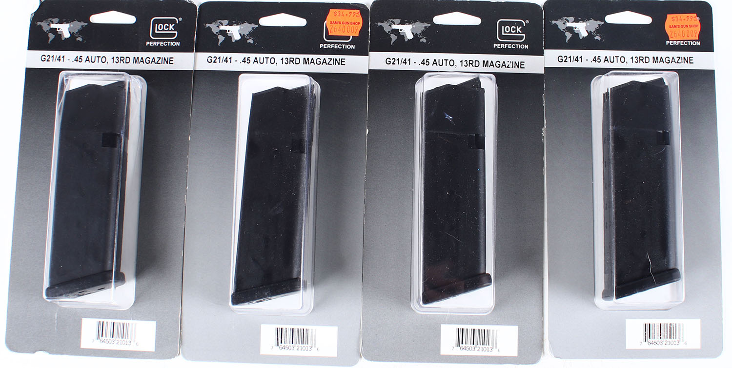 Lot of 4 Glock pistol mags, .45 auto 13 rd mag. Grade: Excellent - Value: 30 to 90