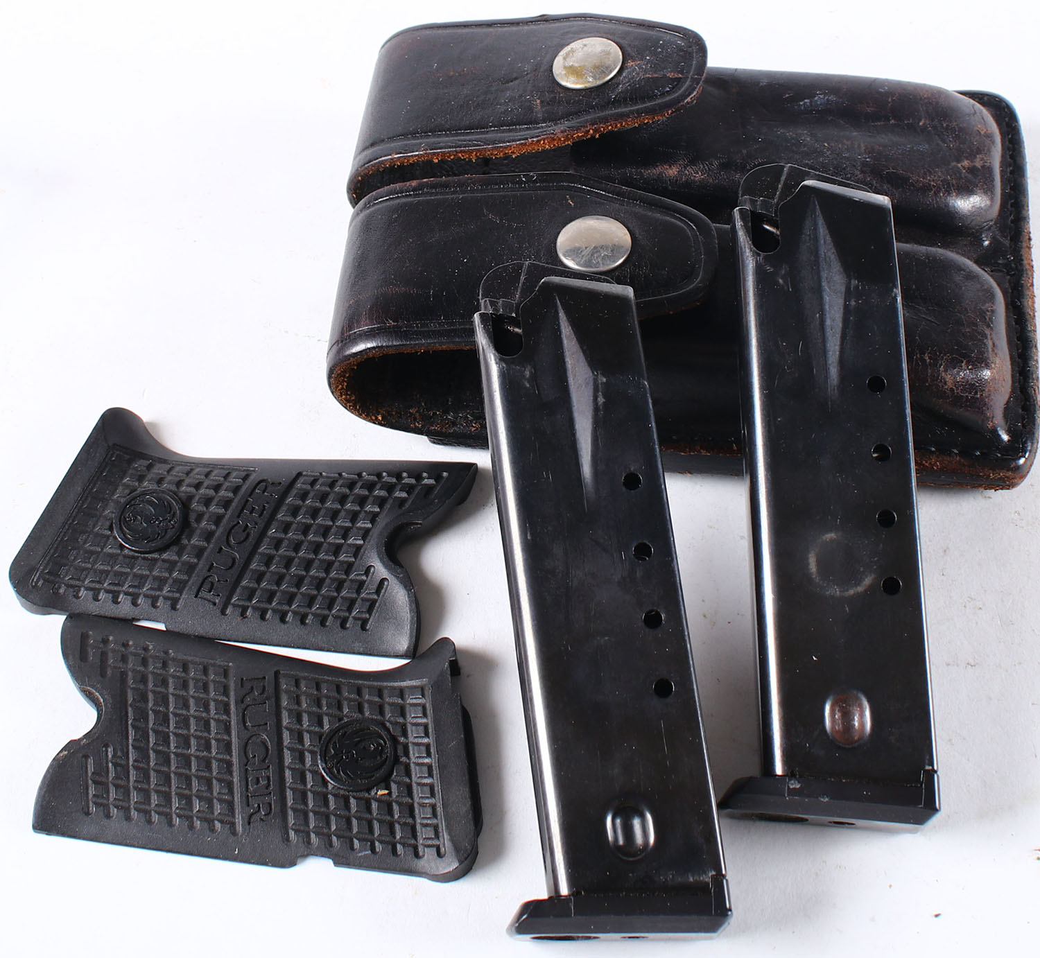 Pair of Ruger 40 cal pistol magazines, in mag pouch with Ruger grips. Grade: Excellent - Value: 20 to 60