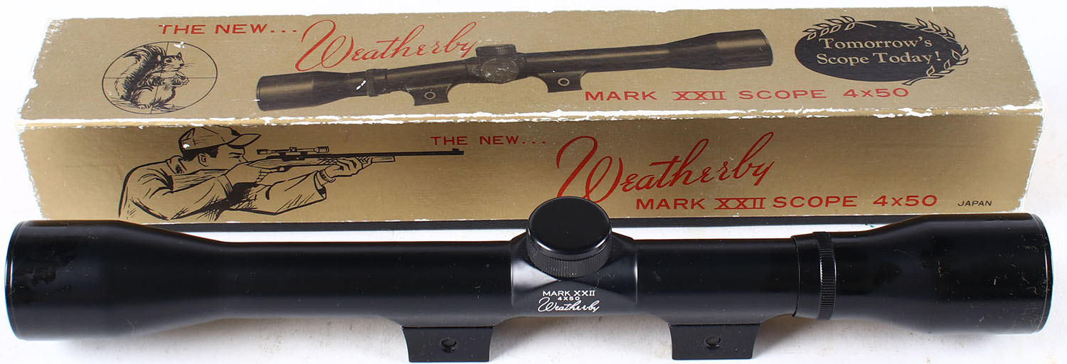 Weatherby Mark XXII scope 4x50, in original box. Grade: Excellent ++ - Value: 150 to 300