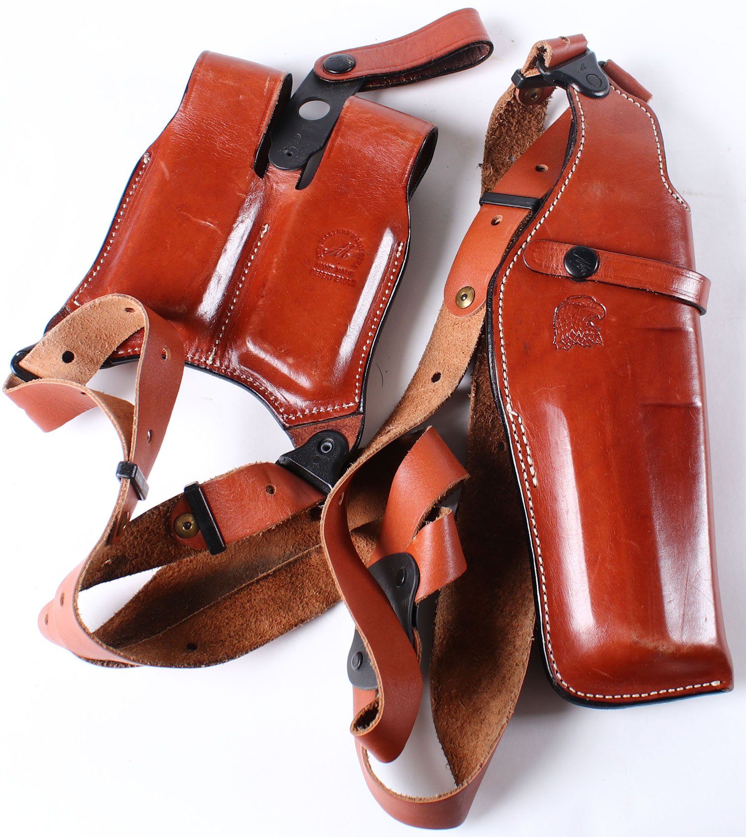 Lot of 2 leather pistol holsters/mag pouch. Grade: Excellent - Value: 16 to 60
